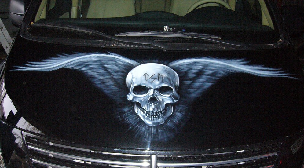 На фото: рисунок "Череп", капот, стоимость 15 000 р., студия МС-Motors (Москва)