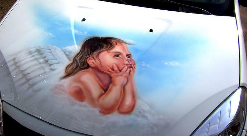 На фото: рисунок "Ангел", капот, стоимость 12 000 р., студия SEM Grafix (Казань)