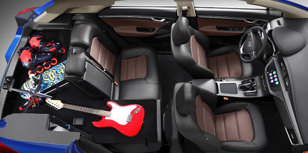 Интерьер у новинки получился лаконичным, но современным. На центральной консоли установлен 8-дюймовый сенсорный дисплей с поддержкой Apple CarPlay. На приборной панели также имеется небольшой цветной экран, на который выводится вся необходимая водителю информация об автомобиле. В список оснащения Geely Emgrand Cross (в Китае модель будут продавать под именем Emgrand GS) могут входить большой панорамный люк, боковые подушки безопасности и кнопка запуска двигателя.