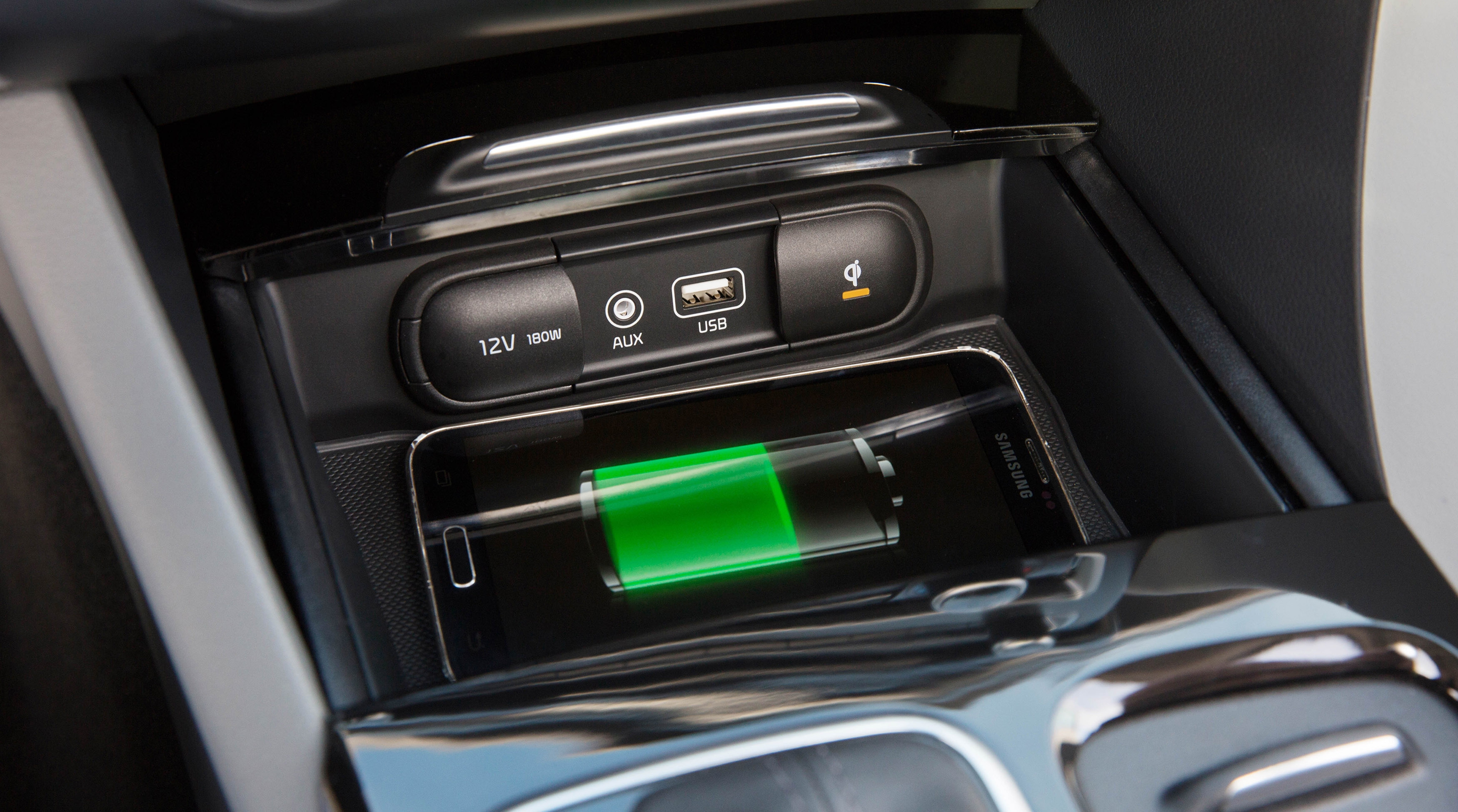 Kia Optima Sportwagon можно оснастить системой беспроводной зарядки для смартфонов, которая активируется автоматически, как только устройство с поддержкой данной технологии оказалось в специально оборудованной нише. Уровень заряда отображается на приборной панели.