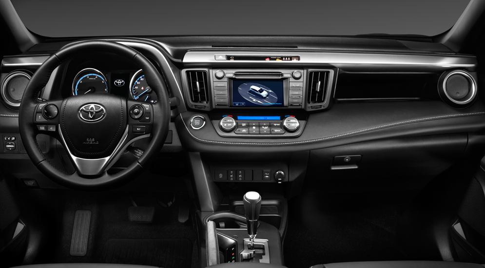Интерьер нового RAV4 получил совершенно новый набор мягких и приятных на ощупь материалов отделки, другую приборную панель с цветным многофункциональным дисплеем диагональю 4,2 дюйма, улучшенную шумо- и виброизоляцию салона, электропривод багажной двери с функцией памяти и возможностью регулировки по высоте. Для увеличения комфорта водителя и пассажиров появились отделение для очков в потолочной консоли, подстаканник перед селектором АКП новой формы, розетка 12V для задних пассажиров.