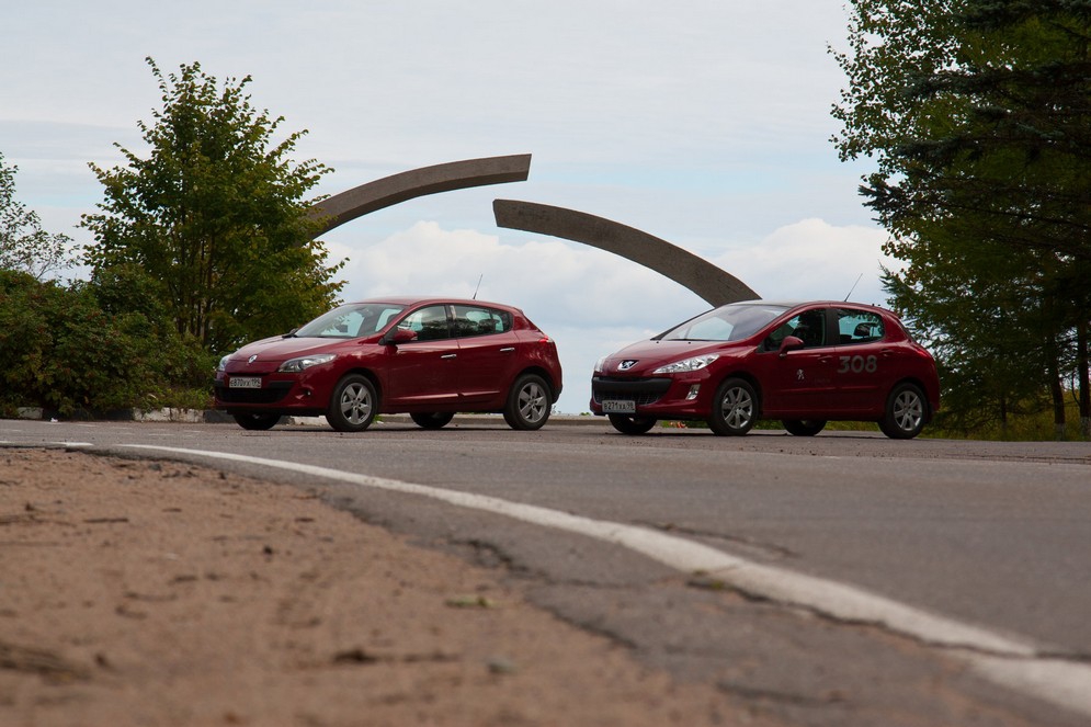 Что касается скоростных способностей, то здесь Пежо 308 чуть впереди. Во многом благодаря 120-сильному мотору (разработки BMW), который оказался заметно бодрее и тише 106-сильного агрегата Megane. Хотя от обеих 4-ступенчатых трансмиссий трудно было ожидать скорострельной смены передач и точного угадывания пожеланий водителя. Впрочем, обе коробки имели ручной режим работы, который, по-честному, мало чем помогал желающим двигаться быстрее. Единственное, чем отличился 308 – режимами «Sport» и «Снег» (старт со второй передачи).