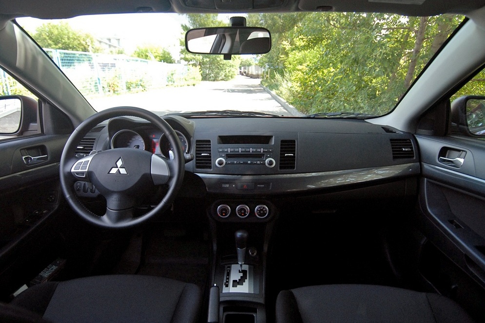 Салон взятой на тест машины ничем особенным от ранее появившихся на рынке Lancer не отличается. Кресла на 2.0-литровом автомобиле лучше спрофилированы, в остальном к салону претензий нет. Даже несмотря на отсутствие продольной регулировки рулевой колонки удобно усесться не составило труда. Широкие боковые зеркала предоставляют отличный обзор, а их регулировка осуществляется с водительского подлокотника на внутренней ручке двери.