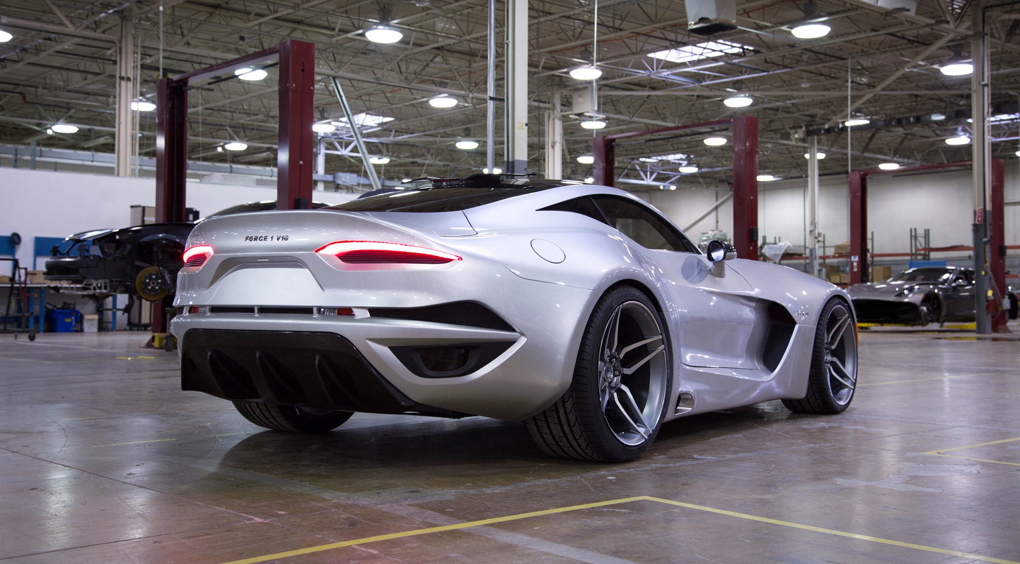 В основу суперкара легло перенастроенное шасси от Dodge Viper с форсированным до 745 лошадиных сил мотором V10 объемом 8,4 литра. Отметим, что базовый мотор от компании Chrysler развивал 645 лошадиных сил. Кроме прибавки мощности, Force 1 V10 обзавелся в качестве опции шестиступенчатым "автоматом", что выгодно отличает суперкар от "донора". Напомним, что Dodge Viper предлагается покупателям лишь с механической трансмиссией.