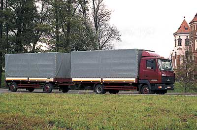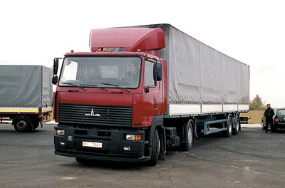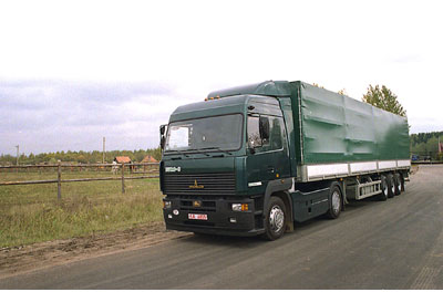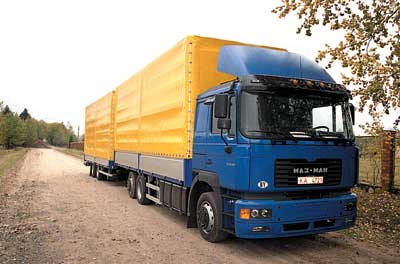 Из желающих "объездить" автопоезд в составе грузовика МАЗ-437141 и двухосного прицепа МАЗ-837300 выстроилась очередь. Это не просто новая модель Минского автозавода, а первая ласточка принципиально нового класса техники, не выпускаемого ни одним автозаводом СНГ. По назначению это автопоезд среднего тоннажа, предназначенный для местных, региональных и междугородных перевозок грузов массой до 10 т. Использование за границей тоже не исключено – грузовые платформы автомобиля и прицепа отвечают требованиям международных перевозок. Для доставки объемных, но легких грузов этот автопоезд будет наиболее рентабельным. По заводским данным, при скорости 70 км/ч он расходует 26.5 л/100 км. Удельный расход на одну тонну груза составляет всего 2.8 л солярки (сравним: для "одиночки" этот показатель равен 4.3 л/т). Сцепка имеет общую полную массу 17.7 т при объеме грузового пространства около 70 м3.