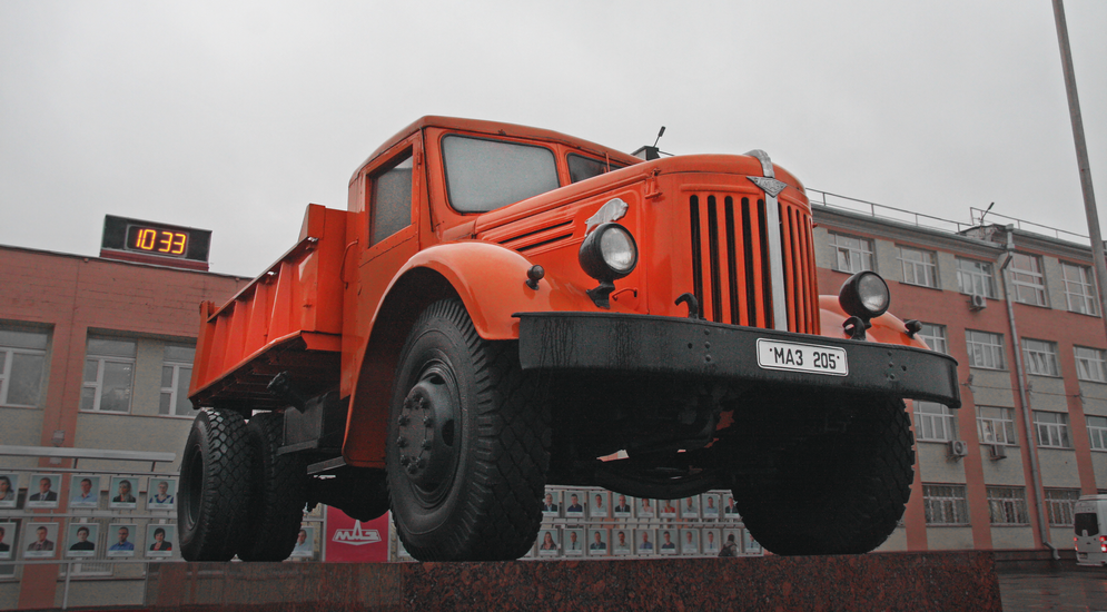 История Минского Автомобильного Завода началась в 1944 году, когда в освобожденном Минске на месте немецких ремонтных мастерских стали собирать и ремонтировать американские грузовики, поставляющиеся в СССР по ленд-лизу. В августе 1945 года вышло постановление Государственного комитета обороны (ГКО) «О восстановлении и развитии автомобильной промышленности СССР» и было принято решение о строительстве завода по выпуску большегрузных автомобилей в Минске. А в 1947 году из Ярославля сюда переводят производство большегрузных автомобилей. Самосвалы ЯАЗ-205 и бортовые грузовики ЯАЗ-210 становятся МАЗ-200, а фигурку медведя на капоте меняют на профиль зубра на боковине.
