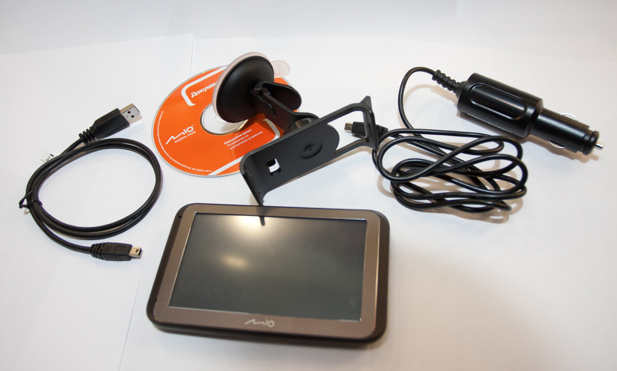 Выложив содержимое коробки на стол, видим базовый пользовательский комплект: сам навигатор Mio Cruiser 5160, кронштейн с присоской для крепления на стекло, автомобильное ЗУ в гнездо «прикуривателя», кабель USB-miniUSB для соединения с ПК, а также CD-диск с инструкцией к устройству.