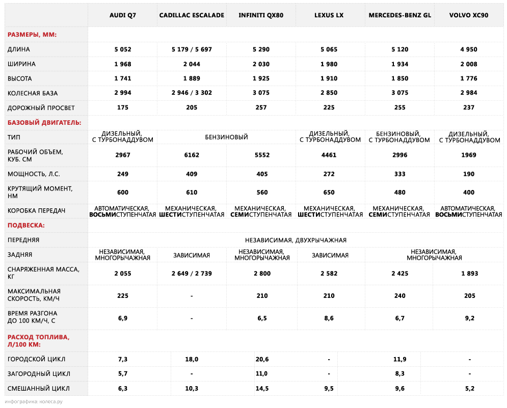Посему мы решили исследовать этот самый обновленный «антикризисный» сегмент, установив для себя следующие ограничения: габаритная длина автомобилей – не менее пяти метров, стоимость – в районе пяти миллионов рублей. И еще одно обязательное условие – принадлежность к премиум-бренду, что безжалостно отсекает такие модели, как Toyota Land Cruiser 200 и Nissan Patrol. Не фигурируют в обзоре и такие любимцы публики, как BMW X5 и Porsche Cayenne – маловаты, а также Range Rover, чересчур высоко оцененный. Тем не менее участников набралось шестеро: три европейских автомобиля, два японских и один американский. Хотя ни для кого не секрет, что именно рынок США является приоритетным для всех машин, каждая из которых может комплектоваться третьим рядом сидений.
