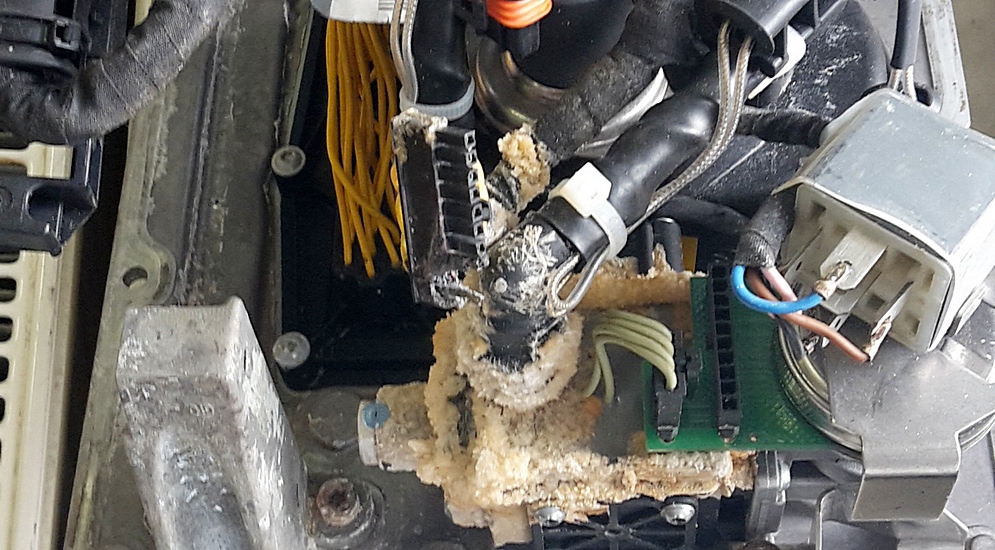 Результат попадания топлива в бак реагента: Прокладки насоса испортились и мочевина потекла внутрь блока управления (коричневые кристаллы)