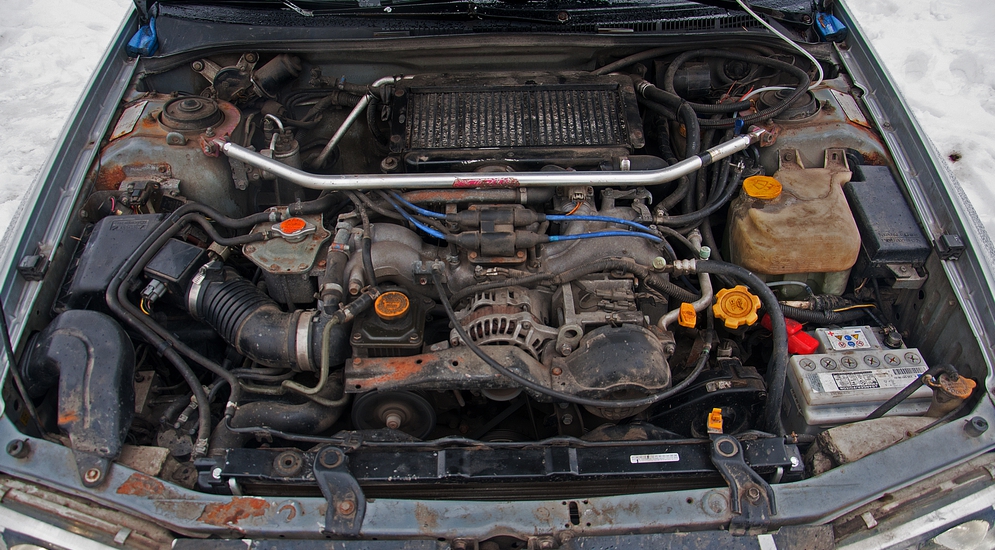 Итак, одометр нашего Субару показывает 354 тысячи километров пробега. Но это – пробег кузова, двигатель здесь меняли не так давно, а его пробег составляет 40 тысяч. Сейчас тут беспредельничает поршнями двухлитровый мотор EJ205. Такие же агрегаты можно встретить на японских Forester Cross Sports и Forester STI, а также на SAAB 9-2X AERO 2004-2005 годов. Его паспортная мощность – 218 л. с., но путём чиповки и замены выпуска (вырезан катализатор и увеличен диаметр труб) удалось добиться 240 «лошадок». Само собой разумеется, моторы EJ давно стали фетишем в среде любителей тюнинга. Мы в этот вопрос углубляться не будем, но отметим, что в зависимости от модификации и года выпуска мотора, возможности по его переделкам очень существенно различаются.