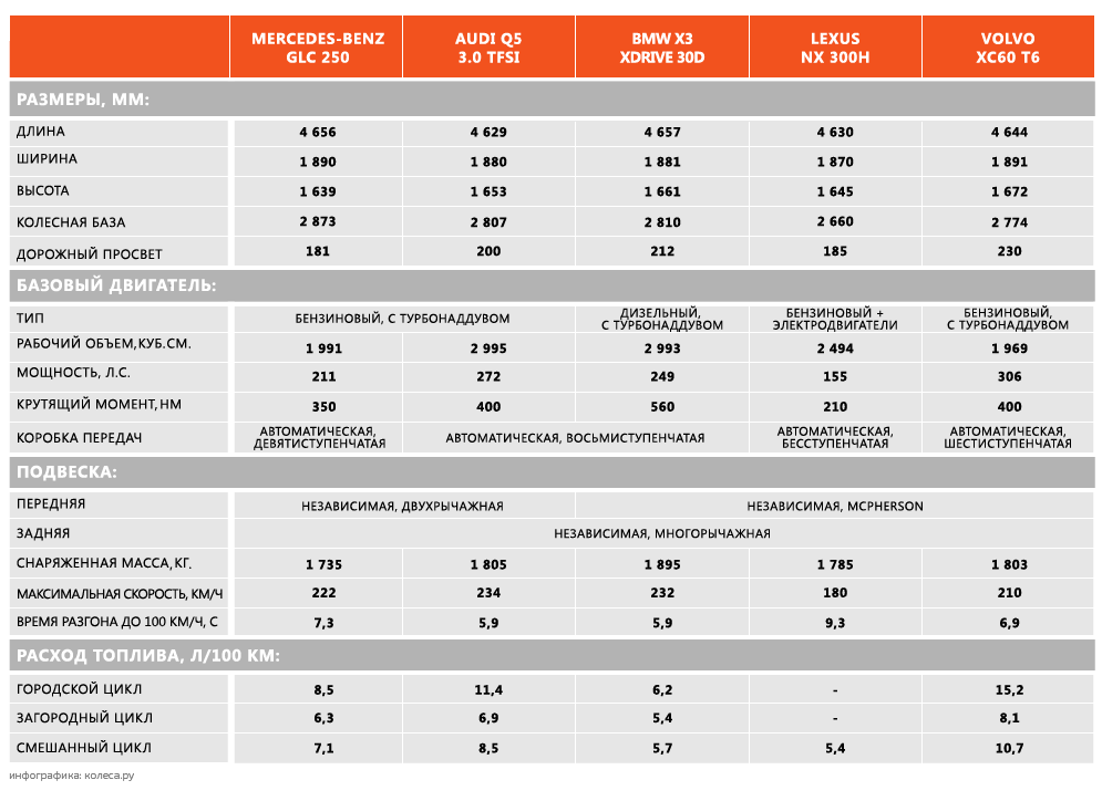 Это самый свежий участник обзора, не считая «Мерседеса», а также самый непохожий на всех остальных. И отнюдь не только «колючим» дизайном, во многом благодаря которому NX за первый неполный год продаж стал главным бестселлером в своем классе. При габаритной длине, вполне укладывающейся в наши рамки, колесная база «японца», позаимствованная вместе с платформой у Toyota RAV4, на 21 сантиметр короче, чем у GLC! Однако, помимо своеобразных пропорций, все вполне традиционно: принципиальная схема шасси аналогична XC60, также есть переднеприводные версии, базовый двигатель — тоже 150-сильный, только не дизельный, а двухлитровый бензиновый атмосферник. Имеется и турбированная 238-сильная версия, причем она снабжена традиционным шестиступенчатым «автоматом» вместо базового вариатора. А за экономию топлива Lexus борется не с помощью «солярки», а, опять же, традиционным для себя путем: топ-версия имеет гибридную силовую установку, обеспечивающую более чем скромную динамику на фоне остальных фигурантов, но невероятные цифры расхода бензина. И такой NX нам по карману.Цены, комплектации В начальной комплектации Executive Lexus NX 300h стоит 2 754 000 рублей. Но японская «база» ощутимо богаче шведской: парктроник, система Smart key, камера заднего вида, мультимедийный контроллер, круиз-контроль, датчик света — все по умолчанию. Колеса — тоже 18-дюймовые, в интерьере — кожа, оптика — светодиодная, пятая дверь — с электроприводом, имеется беспроводная зарядка для смартфона. Однако еще более «вкусные» комплектации Luxury и F Sport Premium нам уже недоступны: они пусть всего на 13 тысяч рублей, но дороже наших трех миллионов.