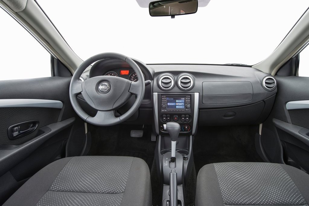 Салон Альмеры оригинальностью не отличается и почти полностью повторяет интерьер Логана: передняя панель, приборы, ручки, дефлекторы – все знакомо. Вот и руль тоже… Бедный, он несет на себе уже третью по счету эмблему: Renault, Lada, Nissan. Будут ли еще варианты?