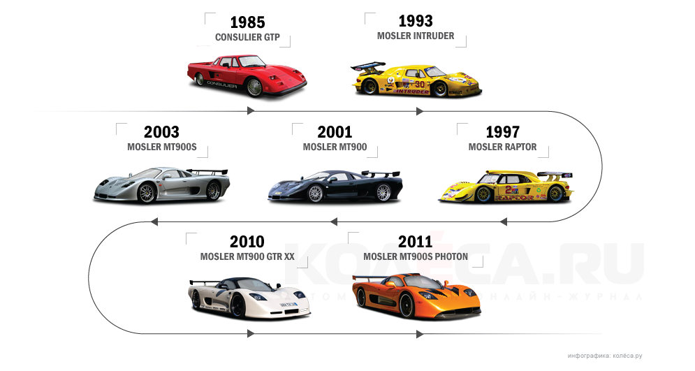 Проектировать МТ900 помогал Род Тренн, один из разработчиков Corvette пятого поколения. Кстати, буквы в названии указывают на создателей автомобиля — Mosler и Тrеnnе, а цифра 900 — проектный вес в килограммах. К сожалению, даже несмотря на кузов-монокок из углепластика, новый автомобиль имел вес 1 175 кг. Любопытно, что на МТ900 стоит 5-ступенчатая механическая коробка передач ZF, которая разрабатывалась для заднемоторных моделей Porsche, и поэтому на среднемоторном Mosler ее пришлось развернуть. За пассажирским кокпитом расположился корветтовский мотор V8 мощностью 350 л.с. Автомобиль разгонялся до "сотни" за 3,7 секунды и развивал 240 км/ч. Был сделан всего один автомобиль.