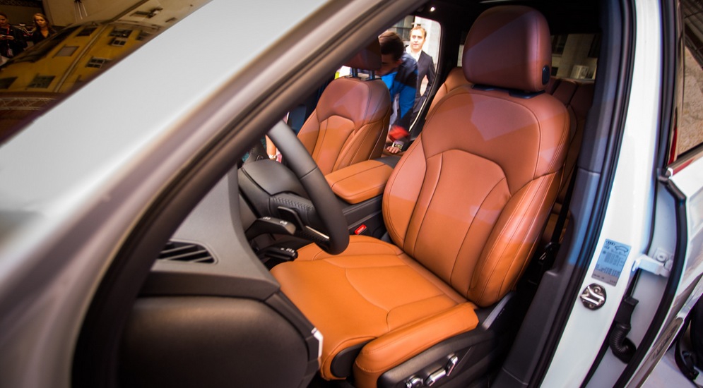 Если в рассмотренном нами недавно Kia Sorento Prime передняя панель выглядит хоть и законченно, но несколько пустовато, то здесь, несмотря на схожую простоту, такого ощущения нет. И проведя пару минут в салоне, быстро понимаешь, почему. Прежде всего, необычная «сплошная» линия дефлекторов вентиляции визуально делит салон пополам, выгодно оттеняя верхнюю часть торпедо из мягкого пластика и, например, контрастную нижнюю с накладками под дерево и яркими кожаными сиденьями. Сами же дефлекторы, будучи элементом функциональным, не создают ощущения пустоты, напротив, добавляя передней панели «осмысленности». Выраженная центральная консоль на «торпедо» здесь вообще отсутствует как таковая: она сведена к блоку управления климатом с небольшим дисплеем и парой «крутилок» да одной линии клавиш – все! Никаких тебе мониторов, россыпей кнопок и клавиш и прочей «излишней нагрузки».