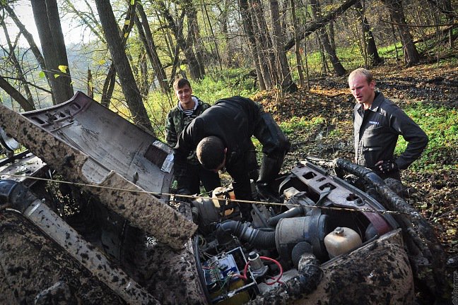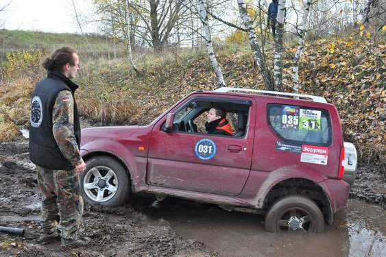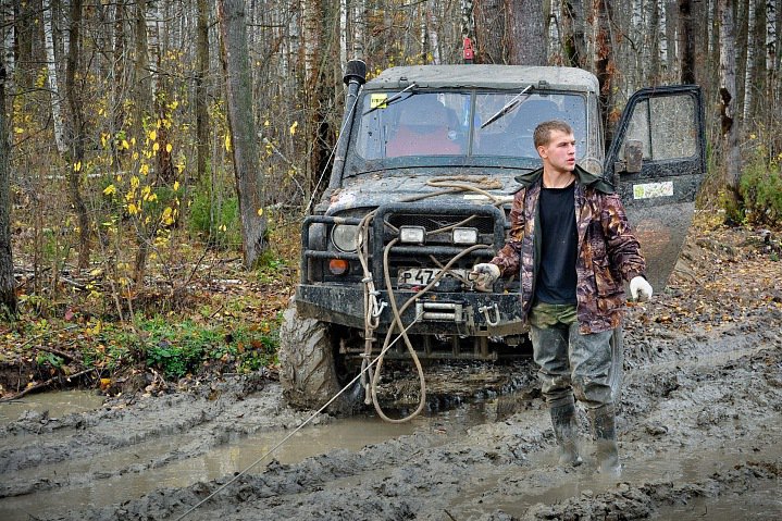 - Обмундирование экипажа (без штурмана на трофи-рейд можно не ехать) должно быть влагостойкое и непродуваемое. Обязательно возьмите резиновые сапоги. Нам, к счастью, с погодой повезло – как раз в день участия выглянуло солнце, на нашем участке было относительно сухо, а температура во второй половине октября поднялась до +16.