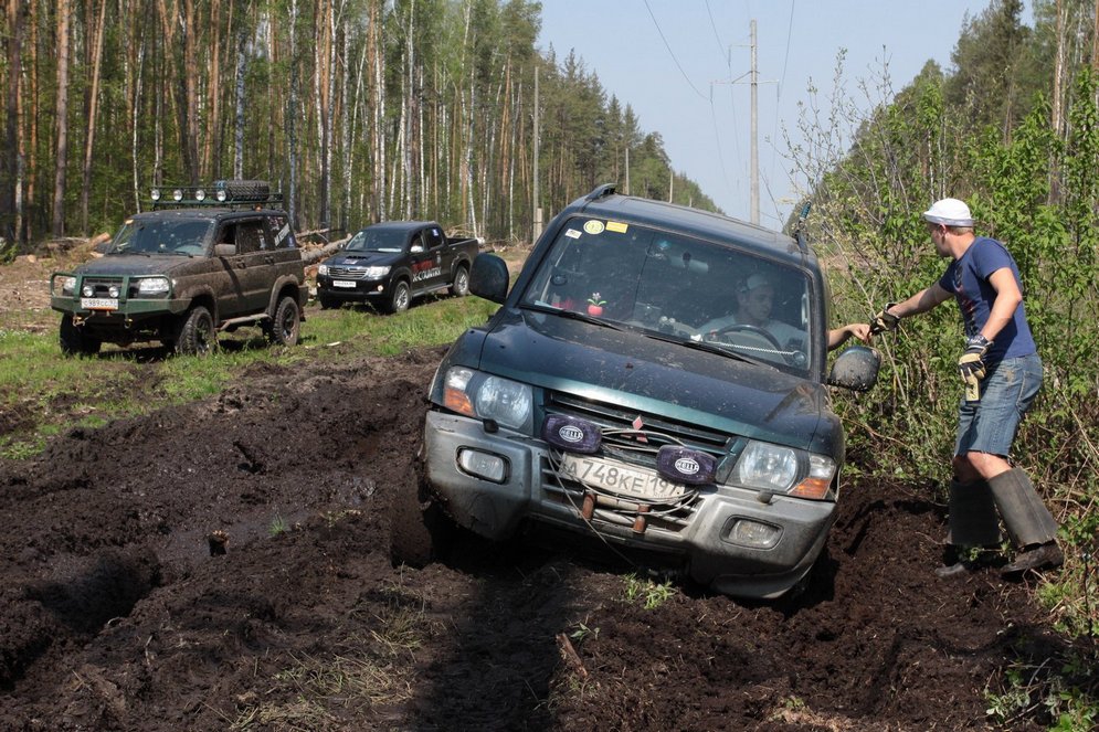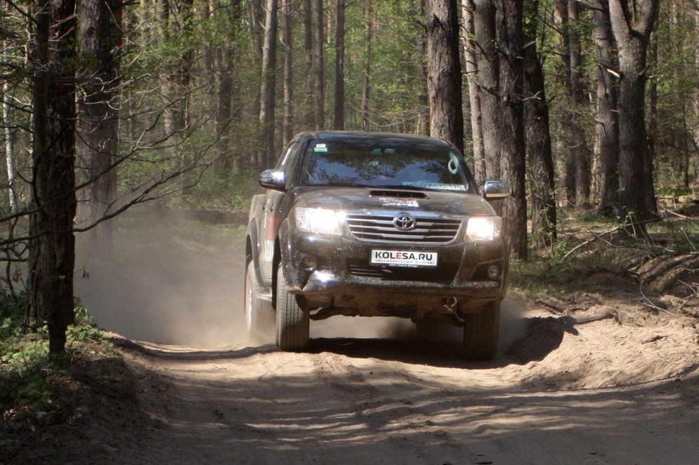 Однако относительная простота трассы пару раз напомнила нам, что резина-то у нас штатная и на большее нам рассчитывать особо-то и не стоит. С первой же грязевой ванной, которую уже успели размесить другие участники, и последующим въездом на гору Hilux справился, но с напрягом.