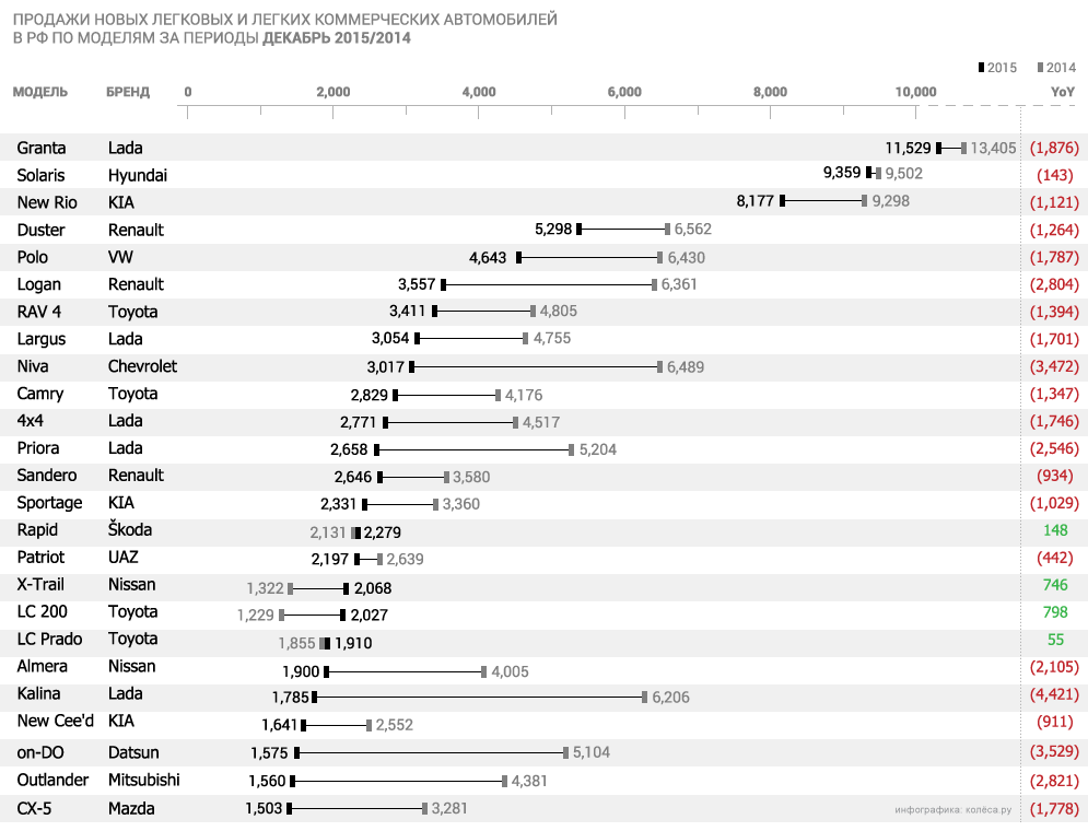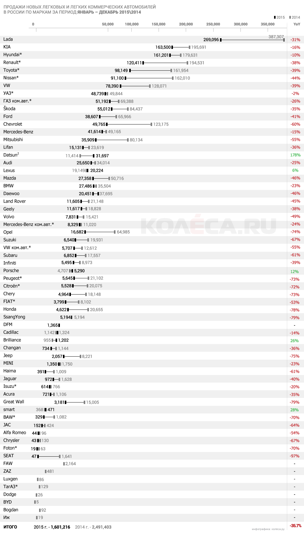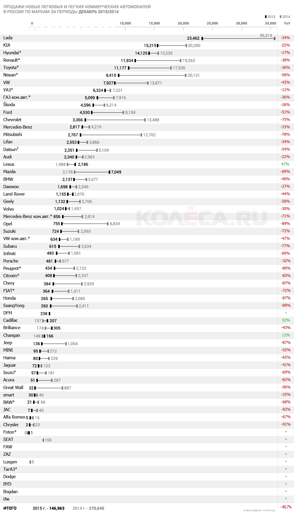 Теперь, располагая итоговой статистикой за 12 месяцев, можно взглянуть, смогли ли какие-то марки (кроме Porsche, о которой мы уже знаем) сохранить или нарастить продажи. Точнее, не взглянуть, а полюбопытствовать, так как объективно было понятно, что это практически невозможно. И статистика это подтвердила: в плюсе только Porsche, добавившая 12% к прошлогодним объемам, ну и Lexus, конечно – не зря японцы постоянно составляли компанию немцам. Им удалось прирастить всего 6%, но в нынешних условиях – это просто великолепный результат. Повторять относительные результаты остальных – значит, по сути, повторять содержание любого ежемесячного обзора, так как ничего неожиданного тут не произошло. Отметить можно лишь другие неплохие результаты: например, УАЗ, который смог в тяжелый год сохранить продажи практически на уровне 2014 года, потеряв всего 2%, а также 28% годового прироста у smart, хоть в штучном выражении это в 571 раз меньше, чем продажи у Lada – всего 471 микрокар. 178% «прироста» у Datsun не показательны, так как продажи начались только в сентябре 2014 года, а +26% у Brilliance – это пока очень, очень локальная победа. В остальном же цифры просто отражают ежемесячную реальность: если из одного отчетного периода в другой марка демонстрирует 30-40% потерь относительно АППГ, таким и будет годовой итог. Одного взгляда на правый столбец таблицы достаточно, чтобы понять, что прошедший год стал тяжелым для всех, и повторять это еще раз нет необходимости. Гораздо интереснее будет посмотреть, что нам принесет год наступивший.