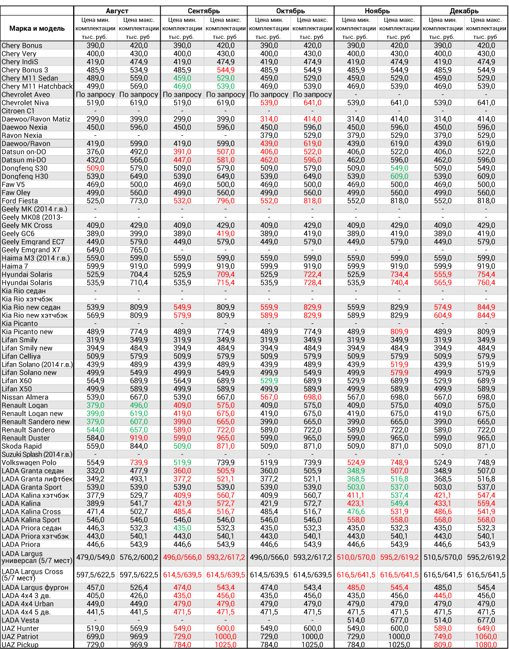 В этом отделении рынка все чуть лучше, чем в ноябре, но ненамного – просто некоторым удалось не так сильно упасть. Skoda, например, просела «всего» на 26%, найдя покупателей для 4 596 машин против 6 214 годом ранее. Toyota «сжалась» на 36%, но она – лидер нашего условного сегмента с 11 177 проданными авто против 17 536. Кстати, наглядно показать успех японцев можно, вспомнив продажи ноября 2015-го – 7 572 автомобиля. Чувствуете, как можно прирасти на 47% в помесячной динамике, но не суметь это показать? Декабрь 2014-го играет в «поймай меня, если сможешь», но кроме Lexus не может никто, а статистика подыгрывает первому. Nissan, идущий следом за Toyota, но изрядно от нее отстающий, закончил декабрь с -58% относительно АППГ (8 410 проданных машин против 20 131), а Ford чуть лучше: -51% (4 530 против 9 159). Остальным не удалось удержаться даже в рамках 60% спада: у Mazda -69% (2 176 авто против 7 049 за АППГ), у Mitsubishi – 78% (2 767 против 12 702), у Suzuki -72% (724 против 2 593), а у Subaru -77% (615 против 2 634). GM выступает ожидаемо плохо, продолжая распродажу остатков: Chevrolet выпустил со складов 3 366 автомобилей относительно прошлогодних 13 488, что дает -75%, а Opel – 755 относительно 6 834, что означает 89% падения. Примерно такие же результаты у французов в лице Peugeot (434 машины и -80% по сравнению с 2 122 в прошлом декабре) и Citroen (408 штук и -83% по сравнению с 2 337). Внизу – Honda и SsangYong: японская марка отметила спад на 87% (в штуках – 265 против 2 085), а корейская – на 89% (260 против 2 411). Как мы видим, корейцы до сих пор не предпринимают решительных действий, медленно и тихо распродавая складские запасы, хотя мы ждем реакции уже с осени, когда дилеры забили тревогу, сообщая, что автомобилей осталось меньше чем на месяц.Бюджетный сегмент