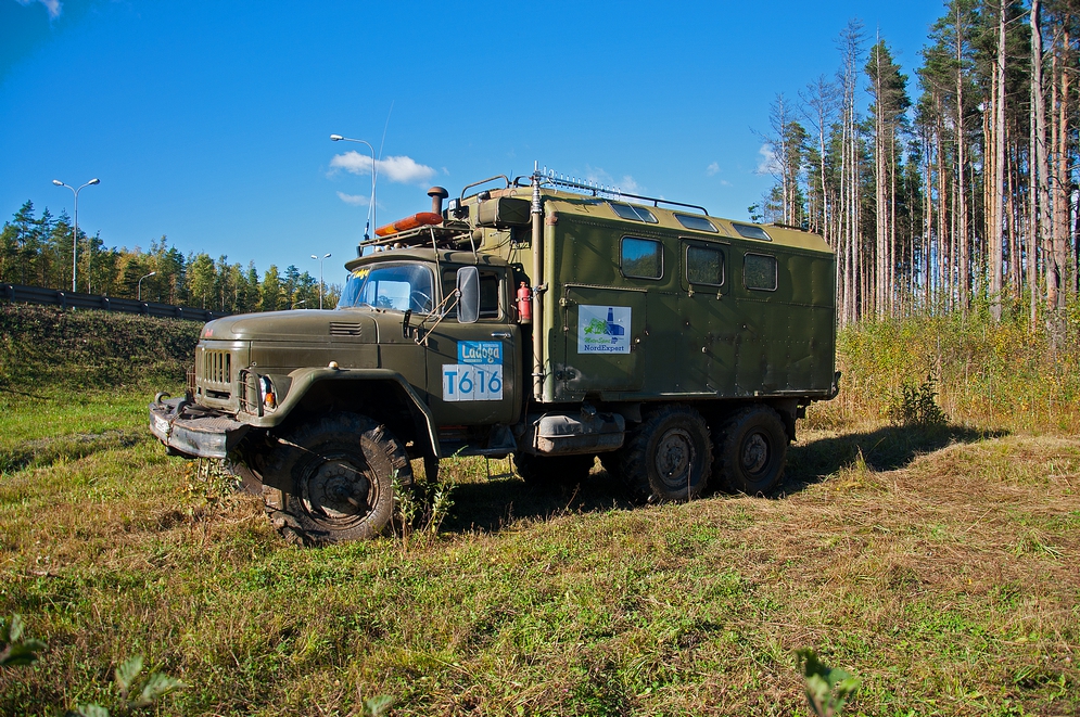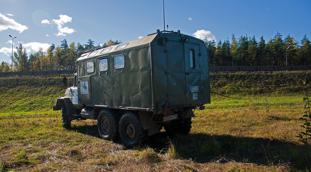 Кунг. Какое странное слово. Не думали, откуда оно взялось? Некоторым покажется, что это какое-то заимствование из иностранного языка, но это не так. «КУНГ» – сокращение от «кузов унифицированный нулевого (нормального) габарита». И появился этот термин как раз у нас, а точнее – в армии. Первые кунги стояли именно на ЗИЛ-157 и 131, а потом и на ГАЗ-63, ГАЗ-66, КАМАЗ-4310, Урал-375. Чем хорош кунг – это тем, что ездить в нём приятнее, чем в открытом кузове или под обычным брезентом. Какое-никакое отопление, ветра нет, сиди и наслаждайся. Но не тут-то было. На любых приличных кочках (а их мы проехали немало) в кунге швыряет из стороны в сторону. Хвататься приходится за всё более-менее неподвижное, упираться в пол ногами и беречь голову. Мне там не понравилось категорически. Хотя, думаю, в минус двадцать пять я бы туда залез с удовольствием, так что обычно кунг – вещь незаменимая.