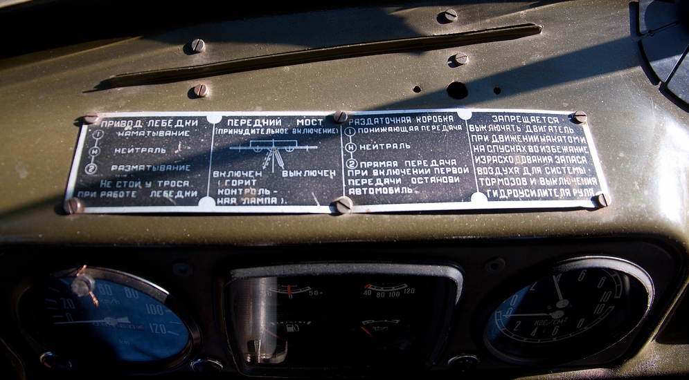 Первое, на что обращаем внимание, – это количество информационных табличек и кратких инструкций. Сделано это для того, чтобы восемнадцатилетний воин, попавший сюда по призыву, не сошёл сразу с ума и не угробил себя и единицу техники. Интересно, что все они обращаются к водителю на «ты», тогда как в руководстве по эксплуатации используются конструкции типа «водитель должен», «для этого необходимо» или просто «следует». Видимо, авторы вполне справедливо рассудили, что таблички будет читать обычный солдат, а руководство – офицер. А может, просто экономили место на табличках: «включи» или «закрой» пишется короче, чем «включите» или «закройте».