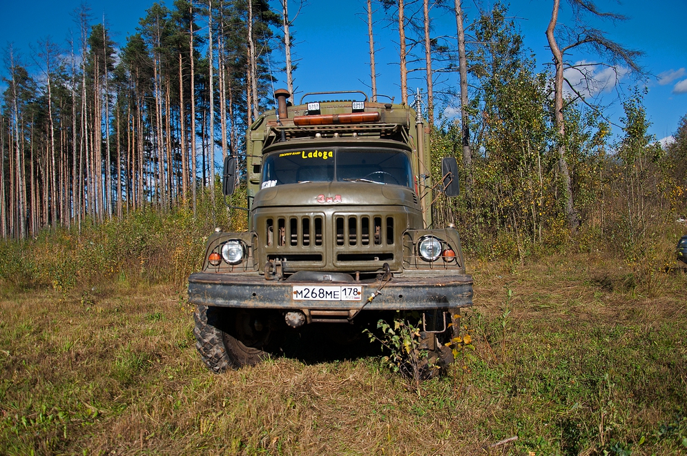 Перед нами по лесной дорожке карабкается Чероки второго поколения, я еду следом на ЗиЛе. И знаете, этот идущий впереди меня немаленький джип кажется мелкой букашкой. Моя задача – не раздавить нечаянно это букашку. Объезжать ямы и лужи? Да зачем! К тому же на этой узкой дороге мне было не так-то просто хотя бы удержать грузовик. Люфт руля даже по паспорту может достигать 25 градусов. А с учётом того, что машина ползёт на размытой дороге и скребёт ее тремя ведущими мостами, управление становится вещью сложной. По крайней мере, без надлежащего опыта. Доехав до места, где Чероки благоразумно остановился, едем дальше. Даже на второй передаче ЗиЛ ползёт потихоньку и уже просит воткнуть третью. А всё из-за включенной «понижайки», потому что дороги уже, в общем-то, нет. На панели горит лампочка, сигнализирующая, что передний мост подключен. По дороге успеваю оценить необходимость лючков в крыше кабины: при опущенных боковых стёклах очень просто получить по лицу веткой дерева. Тут-то и приходится закрыть окна и открыть лючки: свежий воздух есть, а угрозы получить по морде от мстительной берёзы или осины нет. Однако вот оно, первое препятствие: лежащие поперёк дороги деревья. Я даже успел расстроиться: как так, ведь только начали! Но, как выяснилось, пара стволов для ЗиЛа – это спички. Переехал и почти не дёрнулся. Правда, пришлось включить первую передачу