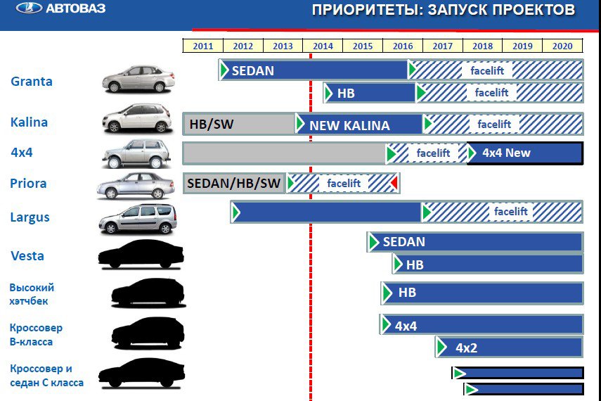 В плане также указано примерное время обновления существующего модельного ряда. Так, в 2015 году на рынок может поступить Lada 4x4 в измененном виде, рестайлинг седана и хэтбека Lada Granta планируется на вторую половину 2016 года, ближе к 2017-му будет обновлена Lada Kalina и Lada Largus.