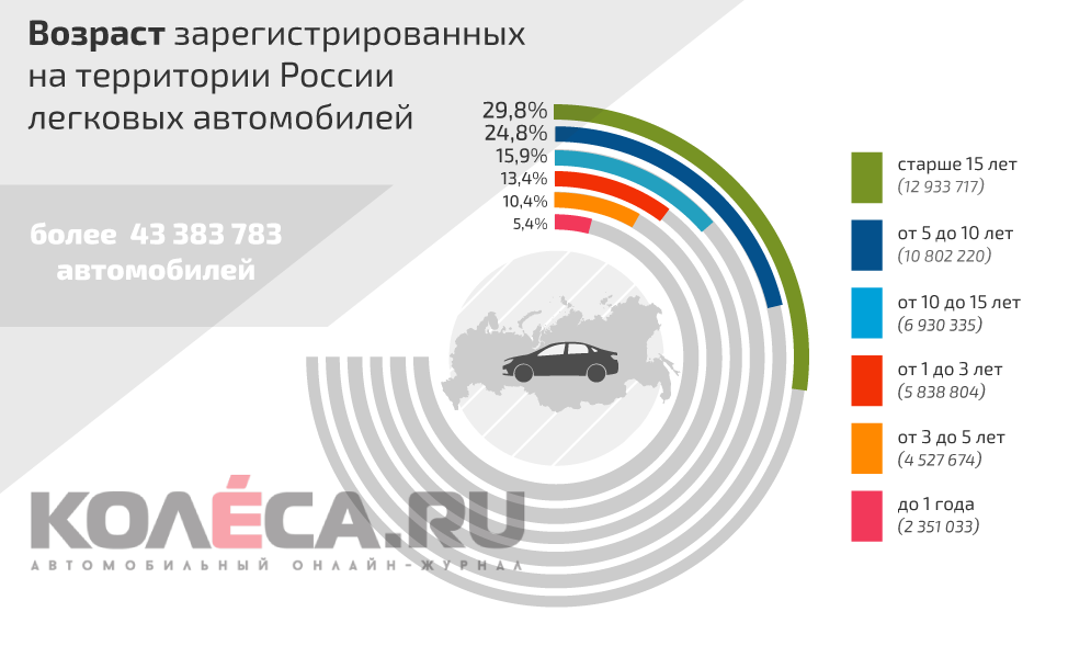 В настоящее время автовладельцами являются 48% россиян. Ранее сайт "Колёса.ру" публиковал рейтинг возраста автомобилей, эксплуатируемых на территории РФ. Согласно данным на 2014 год, около трети россиян ездят на машинах старше 15 лет и только у 5,4% автомобилистов транспортному средству меньше 1 года.