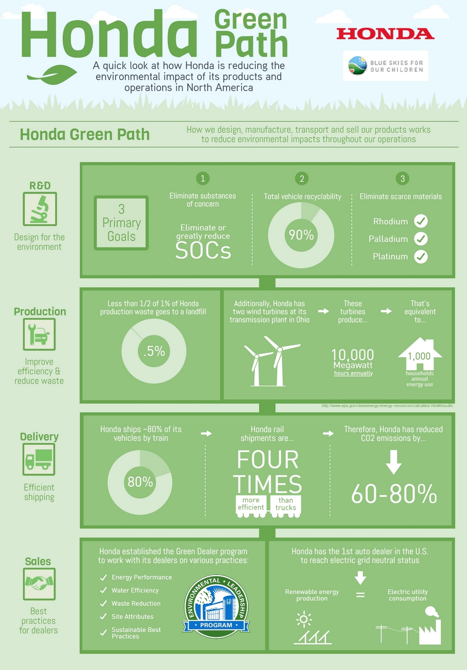 Проект "Зелёный путь" включает в себя разнообразные меры по постепенному сокращению использования вредных веществ, а позже и полного отказа от них при производстве автомобилей. Honda также стремится к тому, чтобы сократить объёмы вредных выбросов и использовать меньше воды. Экологические меры затронут даже доставку готовой продукции дилерам, которая должна стать "зеленее".