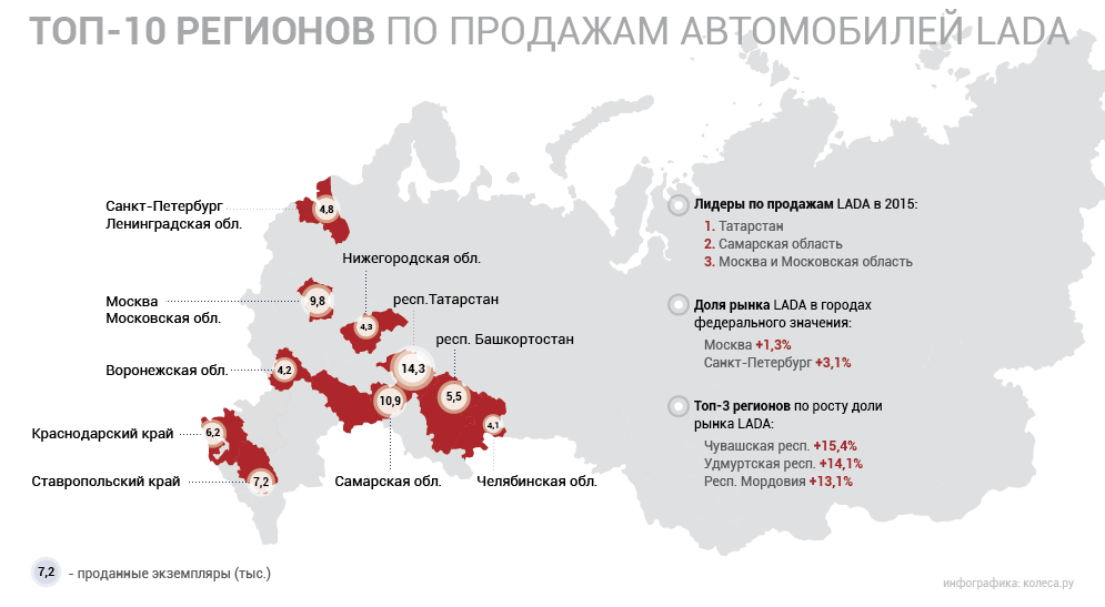 Автомобили марки Lada продолжают пользоваться спросом у россиян, несмотря на спад продаж на рынке РФ. Интересно, что за первую половину 2015 года бренд смог усилить позиции не только в провинции, но и в центральных городах России – на 1,3% в Москве и на 3,1% увеличилась доля в Санкт-Петербурге.