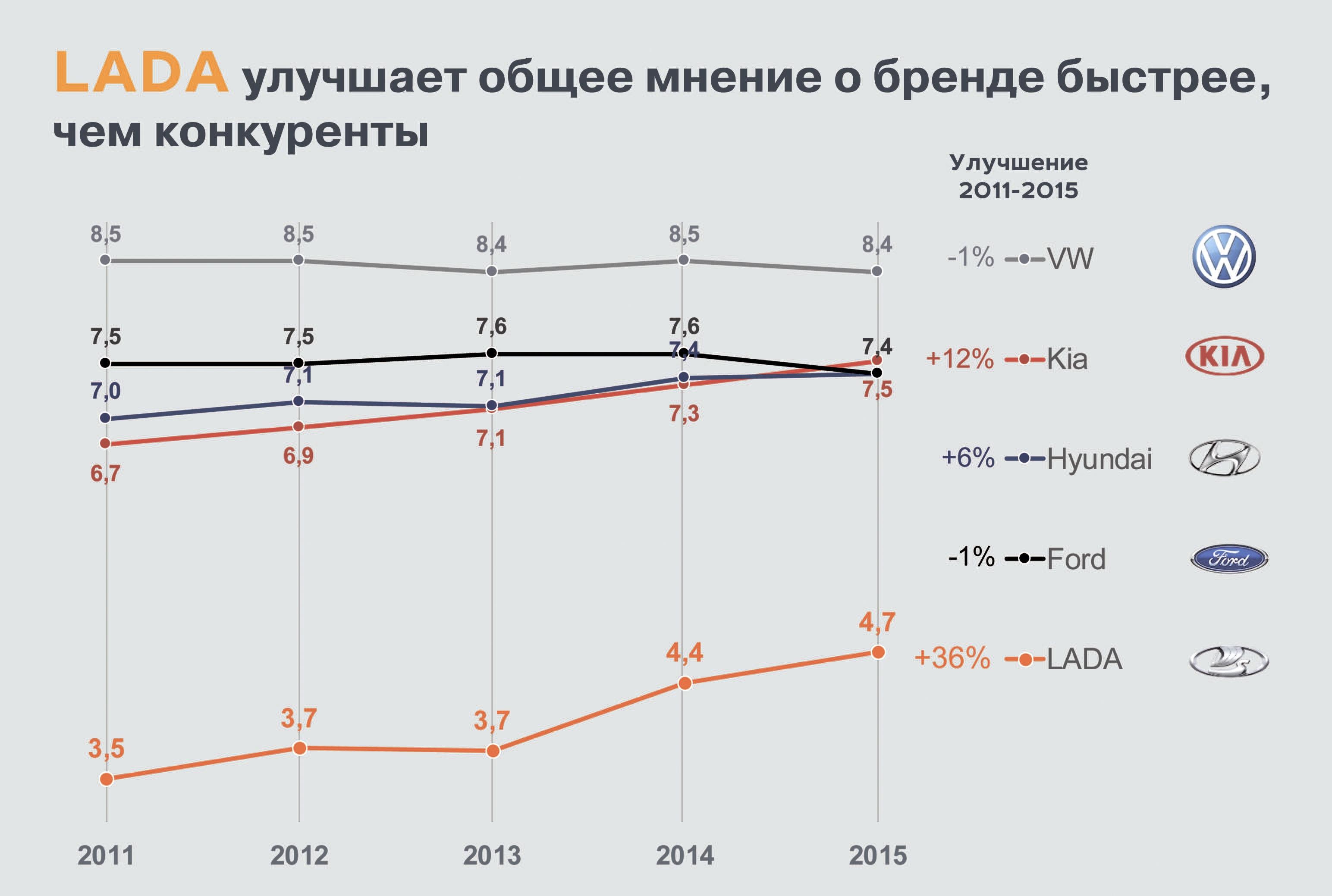 Согласно данным АВТОВАЗа, мнение о бренде Lada с 2011 по 2015 годы улучшилось на 36%, что является абсолютным рекордом среди компаний, выпускающих основных конкурентов Lada: Volkswagen, Ford, Kia и Hyundai. Стоит отметить, что рост показателей наблюдается с 2014 года — с момента, когда АВТОВАЗ возглавил Бу Андерссон.