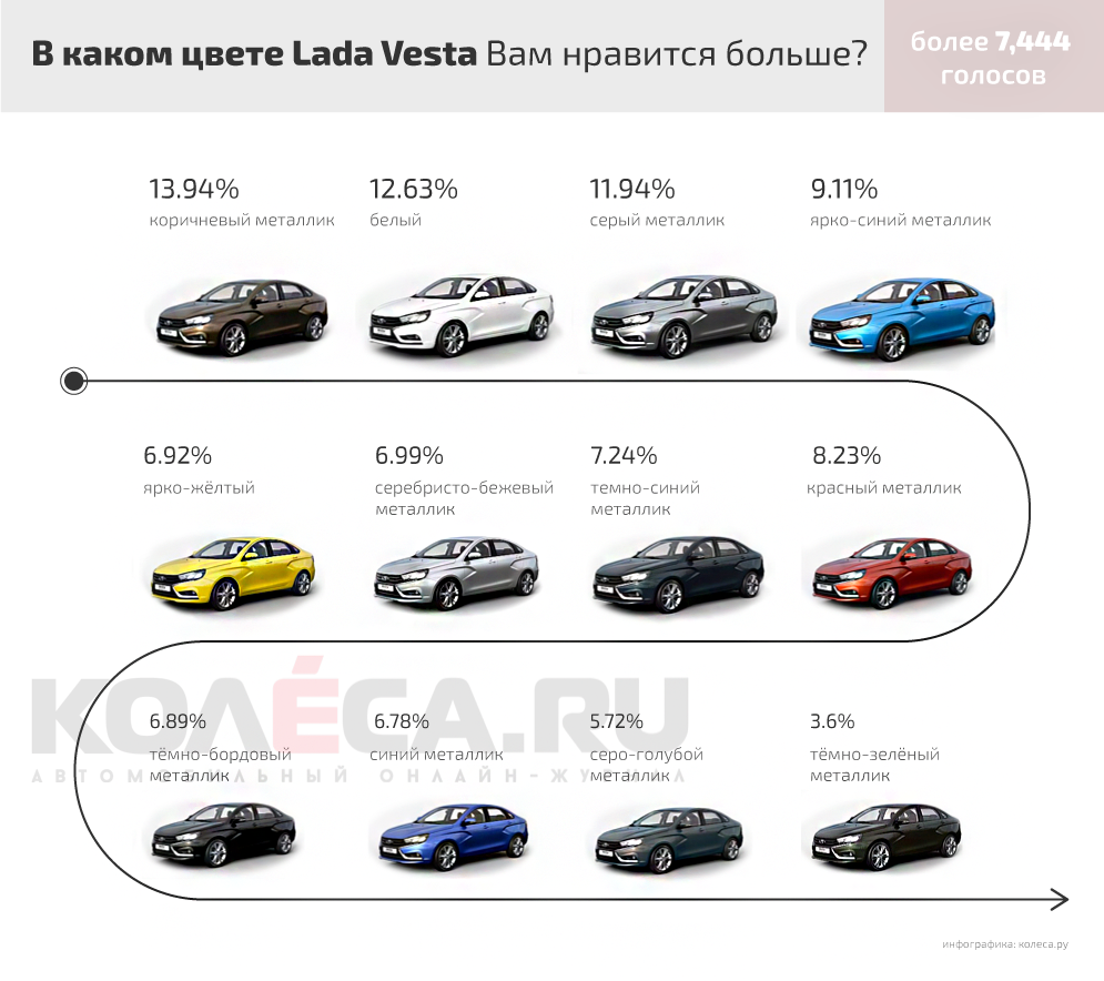 В опросе приняло участие более 7 400 пользователей. Самыми популярными цветами для Lada Vesta по версии читателей "Колёса.ру" стали: коричневый металлик, белый, серый металлик.