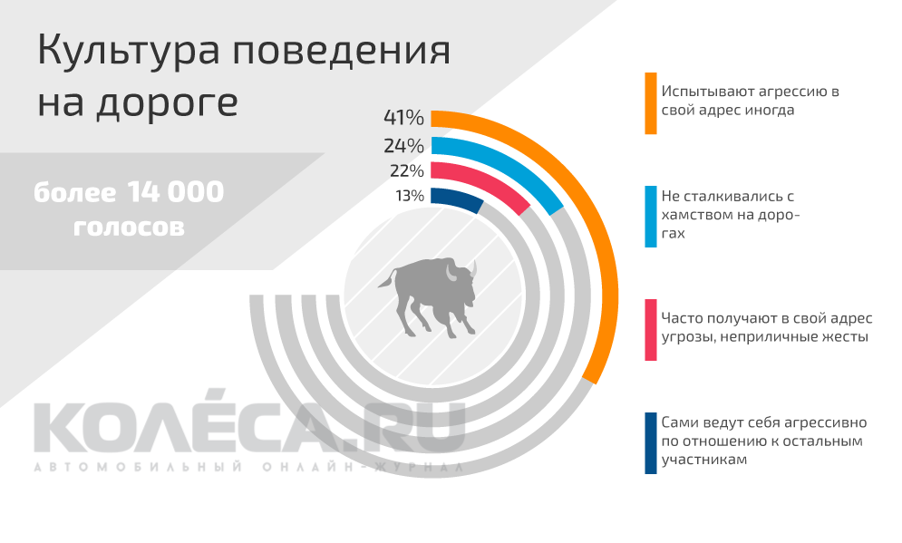 Автомобильный портал "Колёса.ру" провел опрос на тему культуры поведения на российских дорогах. В нем приняло участие более 14 000 человек, каждый из которых мог проголосовать за соответствующий пункт. Получилось, что более 41% опрошенных испытывали иногда агрессию в свой адрес.