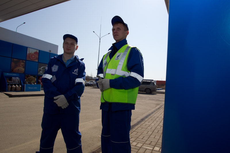 Освоив симуляторы заправки, отправляемся на место трудовой деятельности – АЗС «Газпромнефть» на Дунайском проспекте Петербурга. По жребию мне выпадает роль заправщика. Естественно, меня не могли оставить без присмотра опытного сотрудника. Его стаж работы на заправке, как я выяснил, составлял уже три недели.