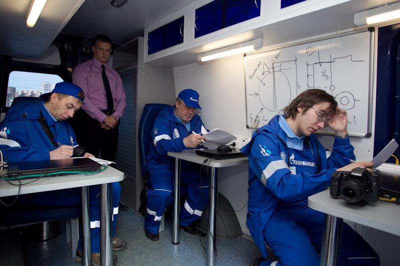 Пока цистерна «разгружалась» к заправке незаметно подъезжает небольшой фургон сети АЗС «Газпромнефть». Это на нашу проверку приехала мобильная группа, в чьи обязанности входит регулярная аттестация сотрудников. Внутреннее убранство фургона — миниатюрный учебный класс: столики с ноутбуками и доски с пояснительными надписями. Система призвана регулярно проверять уровень навыков персонала АЗС.