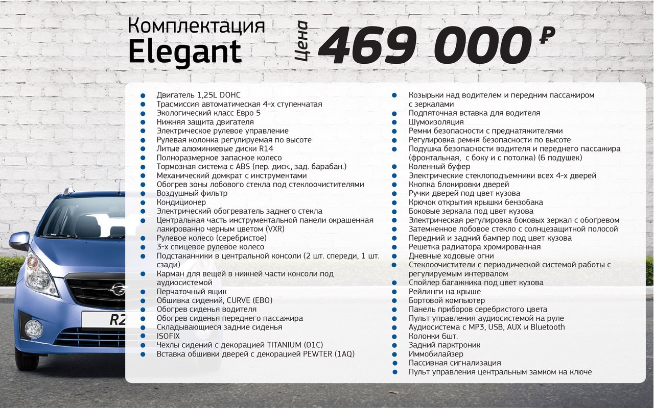В комплектации Elegant Ravon R2 получил литые алюминиевые диски на 14 дюймов, шесть подушек безопасности, подогрев передних сидений, аудиосистему с шестью динамиками, электростеклоподъёмники всех дверей, задний парктроник, рейлинги.