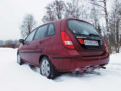 Внешне автомобиль оставляет весьма благоприятное впечатление. Liana, безусловно, узнаваема, несмотря на то, что дизайнерские решения новизной не блещут. Раскосые блок-фары головного света соединяет серебристая полоска с эмблемой "Сузуки". Заднюю дверь практически целиком заняло здоровенное стекло, послужившее местом для номера, "противотуманки" и фонаря заднего хода – решение в духе японских универсалов десятилетней давности, но выглядит необычно и современно. Пропорции автомобиля вполне "минивэновские" – кузов высокий, а капот короткий. К тому же маленькие треугольные окошки в уголках передних дверей недвусмысленно указывают на "автобусную" организацию внутреннего пространства – будем готовы к созерцанию уходящего за горизонт "торпедо".