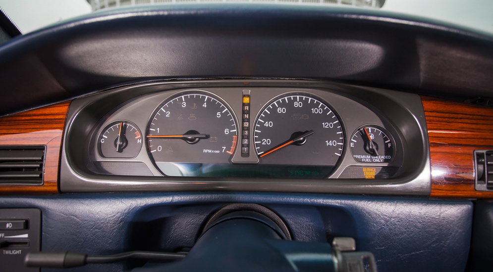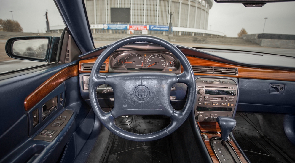 Американцы девяностых годов часто эффектны снаружи, но обескураживающе убоги внутри, причем вне зависимости от ценовой категории. Грешил этим и Cadillac, но Eldorado повезло. За отделку интерьера последнему из серийных personal luxury с фамильным гербом Сира Антуана де ля Мот Кадийяка на решетке радиатора краснеть не придется. Никакого унылого серого винила, салон решен в единой цветовой гамме с кузовом. Общую синюю идиллию высококачественной кожи и алькантары нарушает лишь разбросанная тут и там общекорпоративная серая фурнитура. Дерева в отделке много, но порог, за которым начинается кричащее дурновкусие, не превышен.