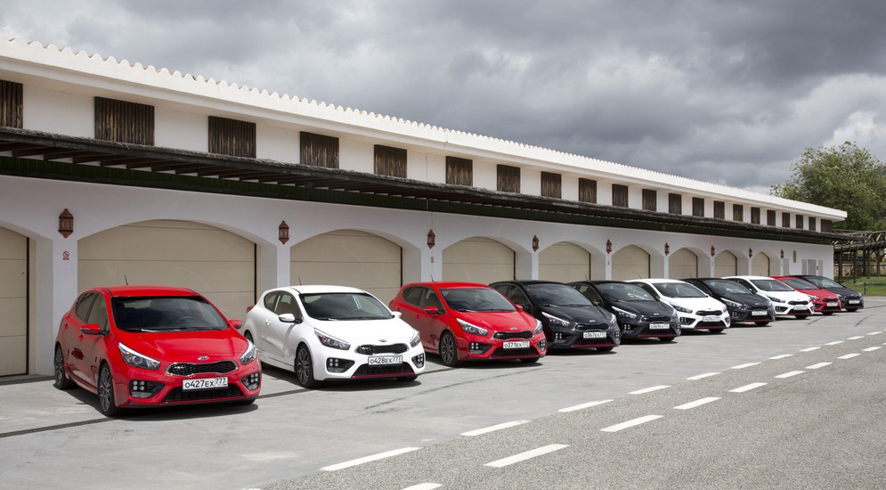 Для Kia cee'd GT пропорции были следующими: жесткость передних амортизаторов на ходе отбоя была увеличена на 30%, а сжатия – на 10%. Задние амортизаторы и вовсе стали на 50% жестче на отбой и на 200% на сжатие. Жестче на 10% пружины, точки крепления передней подвески, а толщина заднего стабилизатора поперечной устойчивости увеличилась на полмиллиметра (до 19 мм). И что бы вы ни думали, даже на 18-дюймовых легкосплавных дисках со спортивными шинами Michelin Pilot Sport 3 автомобиль едет все еще комфортно и проезжает ямы без криков. Но при этом крены кузова стали значительно меньше, рулевое управление, лишившись регулировок, настроено по умолчанию туго, алгоритм работы ABS изменен, а за спицами дисков скрываются красные суппорты и самые большие 16-дюймовые тормоза, которые когда-либо видел корейский хэтчбек.Для проверки всего этого дела был выделен гоночный трек Ascari рядом с испанским городом Рондо. Надо сказать, что на этом хэтчбеке уже можно «зажигать». Для того, кто покупает эту машину, чтобы повыделываться «напомаженной» нижней губой переднего бампера, 204 л.с. (265 Нм) наддувного мотора с турбиной с изменяемой геометрий серии Gamma хватит за глаза. Уверенный подхват на первой, неостывающая динамика на второй, третья передача вообще универсальная и разгоняет машину почти до 150 км/ч, а вот при переключении на четвертую чувствуется несогласованность передаточных чисел – машина немного теряет подхват.