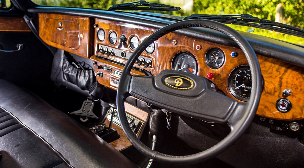 Двухцветная окраска выгодно подчеркивает силуэт и скрадывает громадные размеры автомобиля. Особенно эффектно лимузин смотрится в 3/4 сзади, его ниспадающей кормой можно любоваться часами. Решетка радиатора только на первый взгляд напоминает таковую у Jaguar. У Daimler она с характерным рифлением, которое повторяется и в накладке над номерным знаком. Но спутать легко – особенно сбивает с толку «четырехглазая» оптика, напоминающая сразу о нескольких моделях из Ковентри, причем не только современниках – помните Jaguar S-type? И все же кошка, хоть и отлично смотрится на капоте Daimler, поселилась там абсолютно незаконно: на эти автомобили ее никогда не устанавливали.DS420 хорош… нет, даже великолепен деталями. Белые 14-дюймовые диски с хромовыми колпаками, зеркала на тонких ножках – все настоящее, железное, сделанное на века, рассчитанное не на одно поколение владельцев. А дверные ручки? В век бесключевых доступов так необычно прикасаться к куску настоящего металла с громадной, требующей усилия при нажатии, кнопкой. Так не то, что уже не делают – даже тех, кто так делал, уже скорее всего нет с нами.