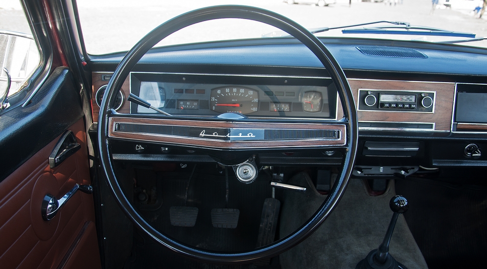 Приборная панель стала чуть более мягкой – изначально ничего мягкого в ней не было и в помине. Чуточку теплоты (хотя бы её видимости) добавляют оклеенные под дерево центральная часть панели и спицы рулевого колеса. Органы управления остались прежними: напольная педаль тормоза стала подвешенной, и ручка стояночного тормоза под панелью стала рычагом между сиденьями чуть позже. Зато поменялись замок зажигания и спидометр. Первый изменил свою позицию – с панели переехал на рулевую колонку, а спидометр стал стрелочным (на первых машинах он был ленточным). Что просто невозможно не отметить, так это новый трёхдиапазонный радиоприёмник А-271 вместо прежнего АТ-66С. Теперь слушать «Маяк» стало, наверное, приятнее.