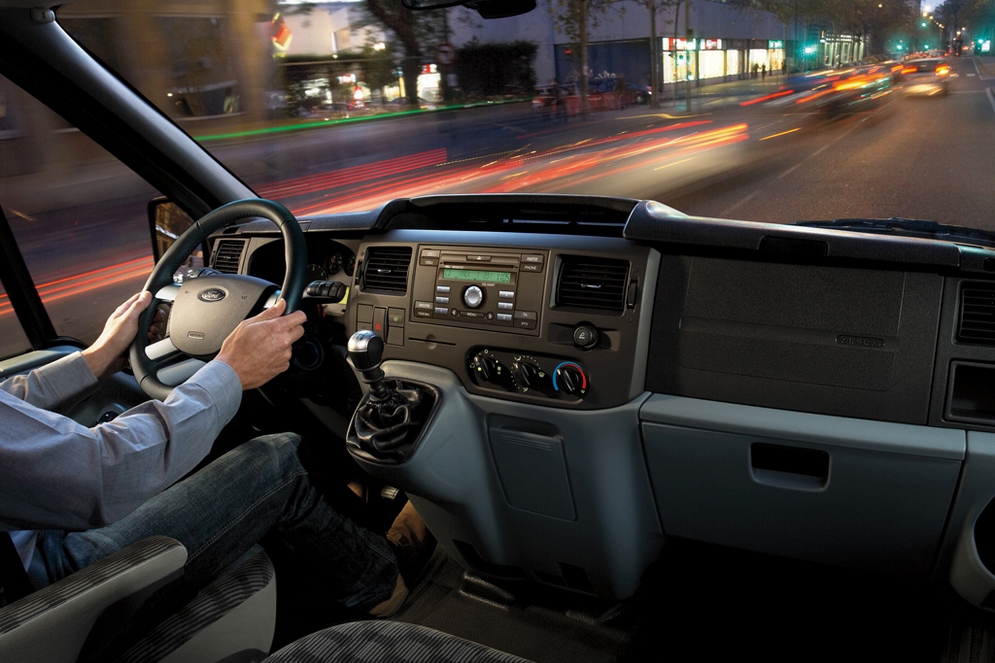 На тест нам достался Форд Транзит в модификации 125T350 со средней длиной базы и средней высотой крыши в переднеприводном исполнении. Цифровая шифровка названия означает, что под капотом трудится 125-сильный турбодизель, а полная снаряженная масса не превышает 3,5 тонн – подойдут обычные «легковые» права категории «В». Правда, оказавшись в кабине автомобиля, понимаешь, что к грузовикам Транзит всё-таки чуть ближе. Упоминание типа привода неслучайно. Дело в том, что Ford Transit является уникальным коммерческим автомобилем, который можно выбрать с любым (!) типом привода: передним, задним или полным. Высоченная посадка открывает панорамный обзор на 180 градусов, а вот к отсутствию внутреннего зеркала заднего вида придётся привыкать. Благо, боковые двухъярусные «лопухи» позволяют достаточно легко определять, что творится позади. Общее оформление приятного на вид, но не на ощупь интерьера тоже отдаёт некоторым гигантизмом: на монументальной центральной консоли, занимающей большую часть панели, расположена двухдиновая магнитола, кнопки которой можно нажимать хоть в перчатках, хоть в варежках, да три рукоятки управления печкой. Здесь же примостился удобный «джойстик» шестиступенчатой «механики». Радует и обилие подстаканников, кармашков и бардачков — только на передней панели их больше десятка (!).