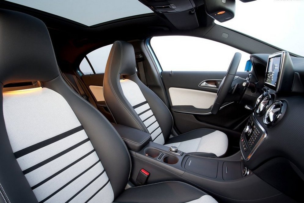 Та же передняя панель с уже знакомым расположением всех органов управления, те же «самолётные» дефлекторы обдува и та же педантичная добротность в отделке. Темный салон разбавляют только вставки под карбон и посеребренный щиток приборов. Правда огорчаться по этому поводу не нужно – для A-class предусмотрено множество вариантов оформления интерьера.