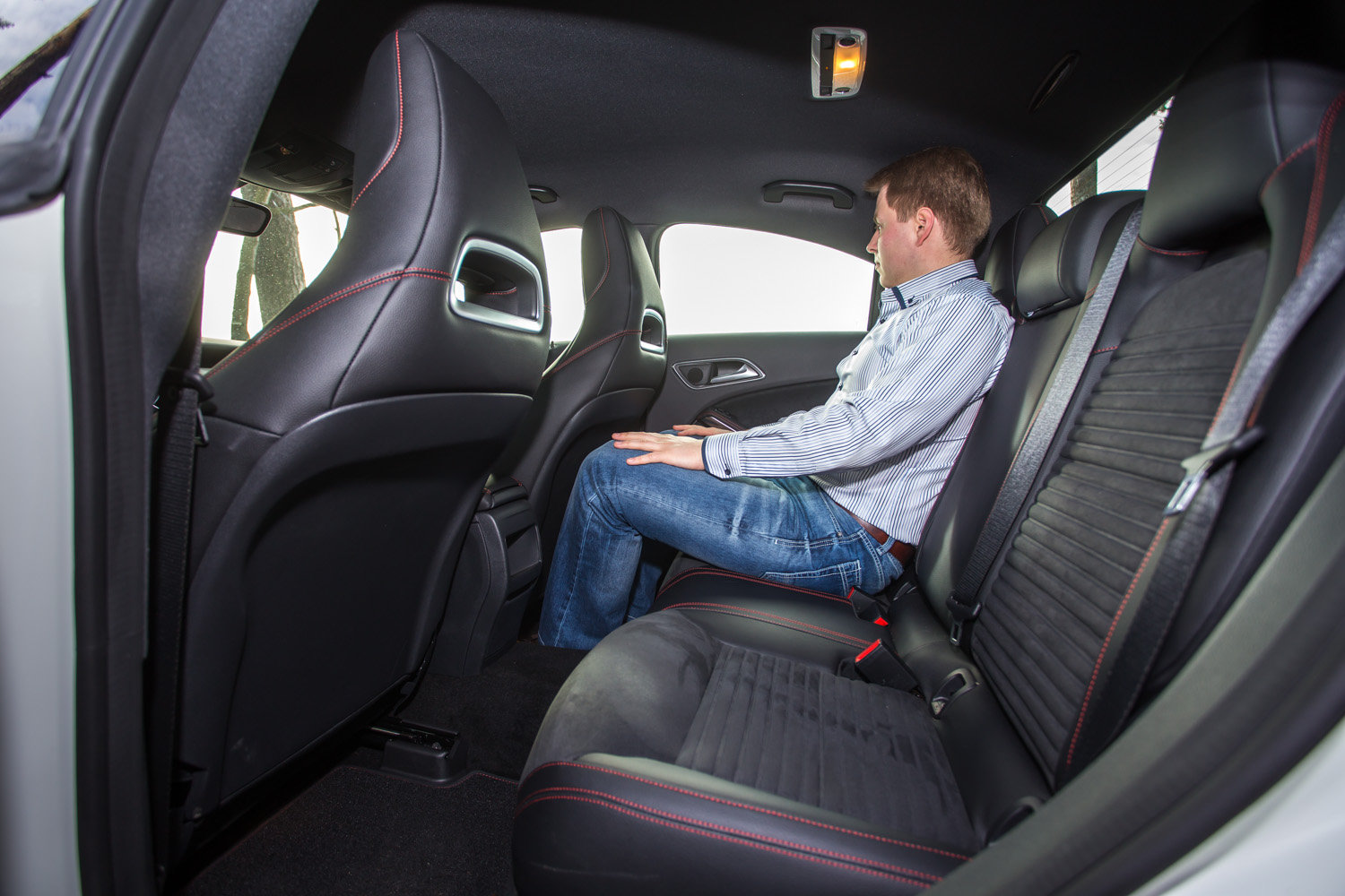 Полностью даёт прочувствовать все «прелести» купе задний ряд CLA, даром, что с отдельным входом. Первый удар по голове при посадке получаешь о верхнюю часть ниспадающего дверного проема, все последующие – при проезде любых неровностей: при росте 180 см голова жестко упирается в крышу. Прибавьте сюда вертикальную спинку дивана, высокий тоннель по центру и минимальный запас пространства до передних кресел.