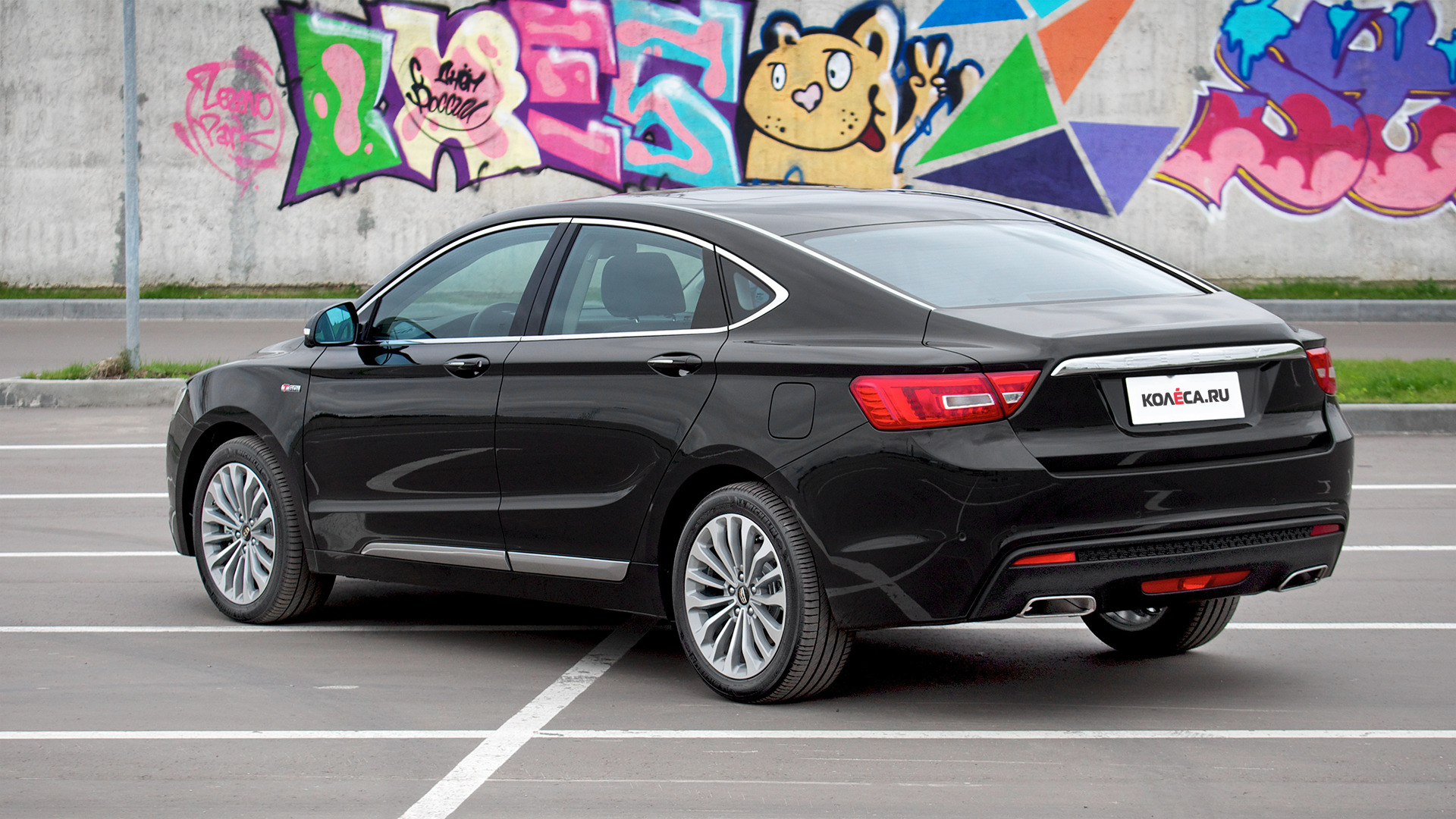 При подробном осмотре с близкого расстояния бросаются в глаза важные детали: объективы камер кругового обзора в корпусах боковых зеркал, под передней эмблемой и на крышке багажника, а также закрытая пластиковой крышкой антенна радара системы активного круиз-контроля. «Фарш» очень даже неплох. И, что самое интересное, Emgrand GT совсем не стесняется своей национальности.