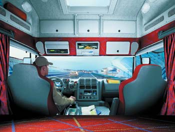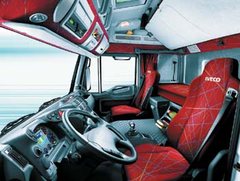 Первыми назвали Stralis грузовиком для водителя сами разработчики. Теперь то же самое могут сделать дальнобойщики. И поводом для этого служит великолепно продуманная кабина. В версии Active Day ее длина составляет всего 166 см, но даже при этом за креслами водителя и пассажира есть пространство шириной 15 см. Спать на региональных и городских маршрутах некогда, а для личных вещей этого места вполне достаточно. Зато версия Active Time длиной 215 см предоставляет одну или две спальные полки с комфортабельным матрацем толщиной 12 см. Кресла выполнены с интегрированными подголовниками и инерционными ремнями безопасности. Сидеть в них очень удобно, благо, диапазон регулировок сделан с запасом. Рулевая колонка меняет положение в двух плоскостях, так что, если кто-то скажет, что не смог настроить ее под себя, знайте: перед вами дилетант и позер. В центре приборной панели – пятидюймовый цветной дисплей. Вообще, пестрота щитка напоминает компьютерный симулятор. В этом смысле создатели явно постарались сыграть на эмоциональное восприятие: попробуй-ка найти нечто подобное. Честно говоря, могли бы сделать попроще.