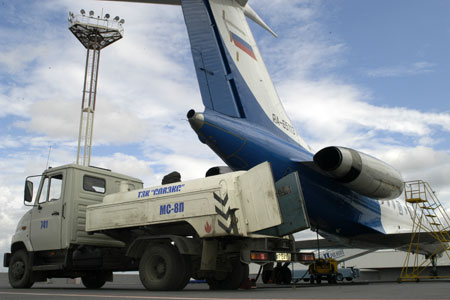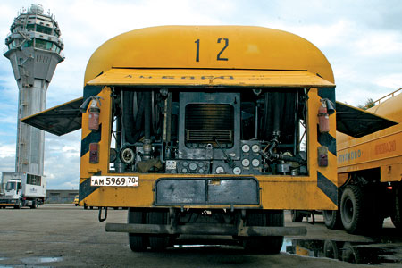 Как известно, самолет машет крыльями потому, что летит, а вовсе не наоборот. А летит он только в том случае, если есть горючее. Для заправки баков воздушного судна керосином в аэропорту служат топливозаправщики самых разных возможностей. Например, в Пулково имеют место быть два вида машин: АТЗ-22 и АТЗ-40. Эти машины отличаются главным образом емкостью цистерн, которая отражена в их названии: керосиновместимость – 22 либо 40 тонн. Тягачи могут использоваться самые разные: КамАЗ, МАЗ, КрАЗ, Renault – все, что есть под рукой. Важнейшая часть топливозаправщика – насос. Скажем, в задней части АТЗ-22 в качестве насоса установлен двигатель от ГАЗ-51.