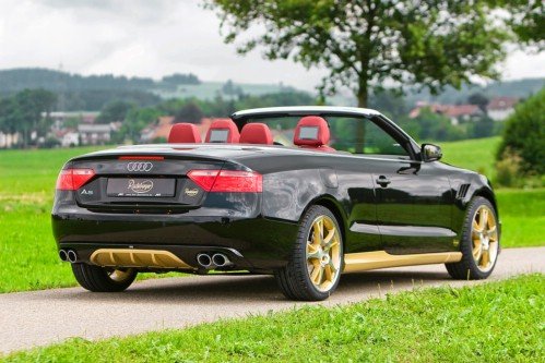Помимо нового обвеса золотого цвета и нестандартных «жабр» на крыльях машина получила встроенные в подголовники передних кресел DVD-мониторы, и новую четырехтрубную выпускную систему, готовую выпустить на улицу рык 2.0-литрового мотора TFSI мощностью 275 л.с. Да, инженеры изменили прошивку системы управления двигателем и турбиной, что позволило агрегату набрать дополнительные 95 л.с., в сравнении с стандартным двухлитровым двигателем А5.