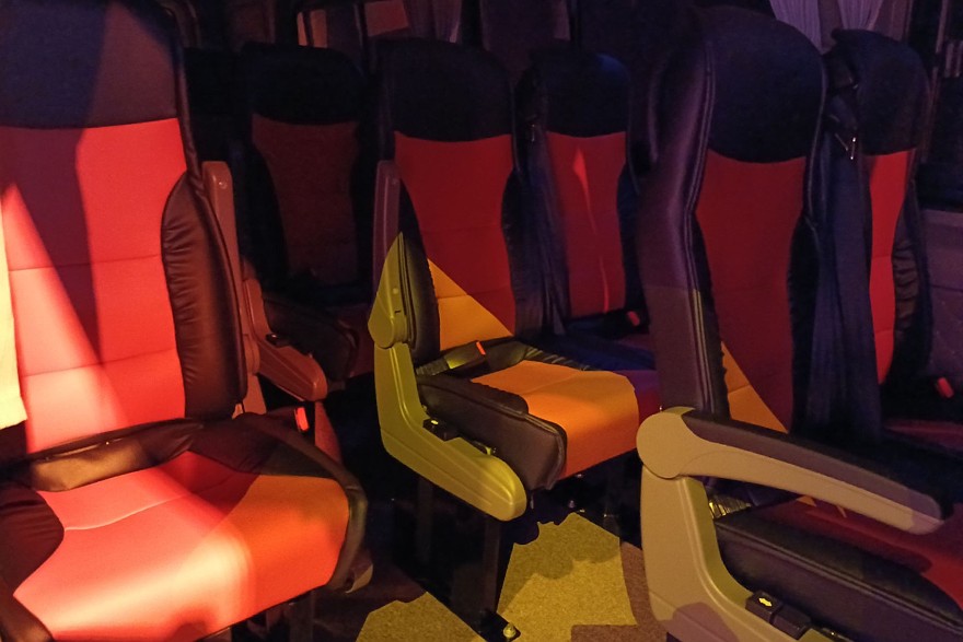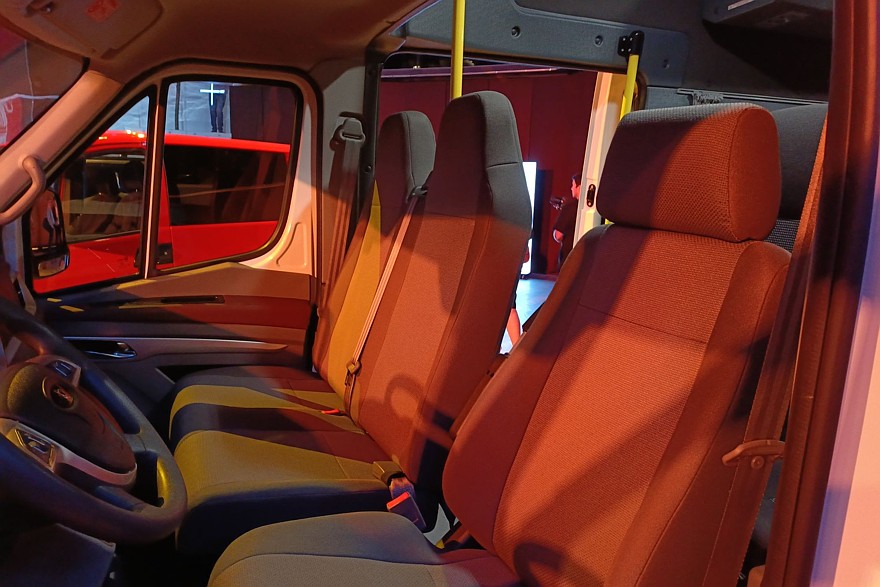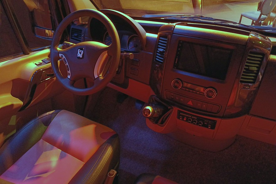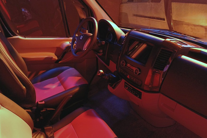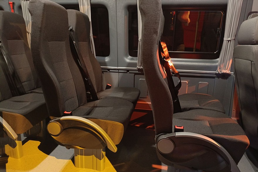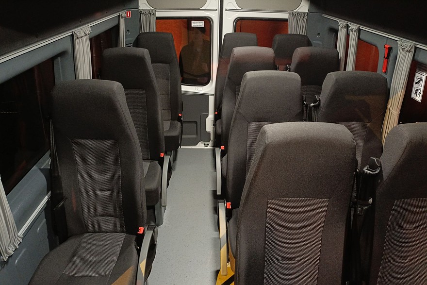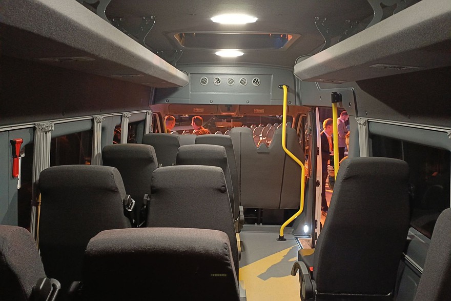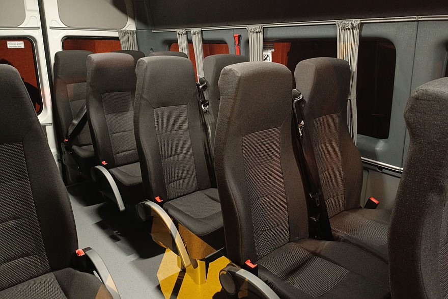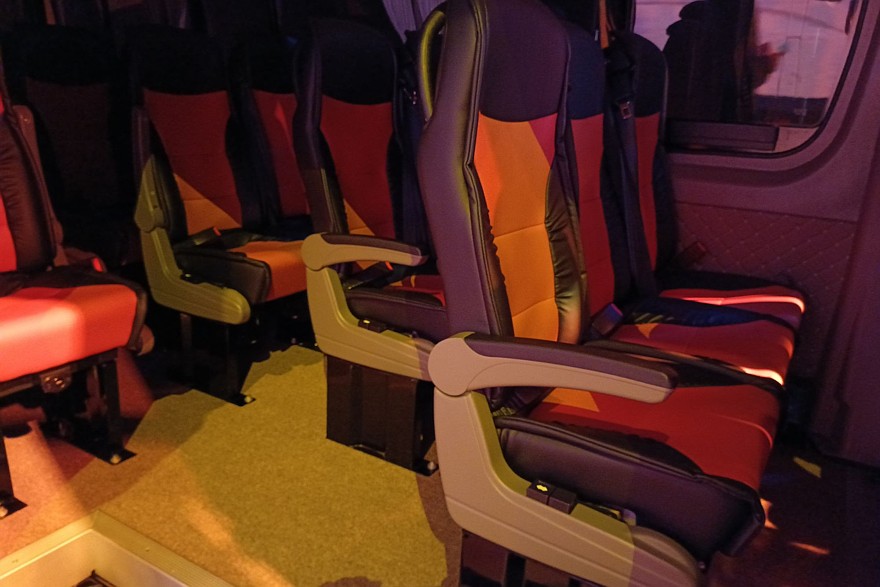 Внутри довольно комфортно даже при максимально плотной 23-местной компоновке. Все-таки колесная база 4325 мм при габаритах машины 7490×2000×2875 мм – это вам не фунт изюму. С такими размерами можно создавать вполне просторные салоны.