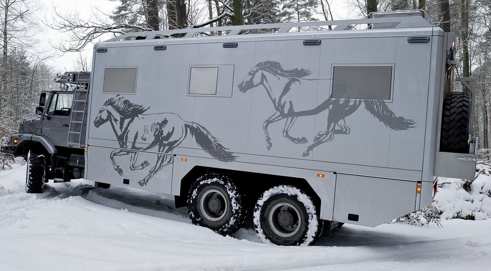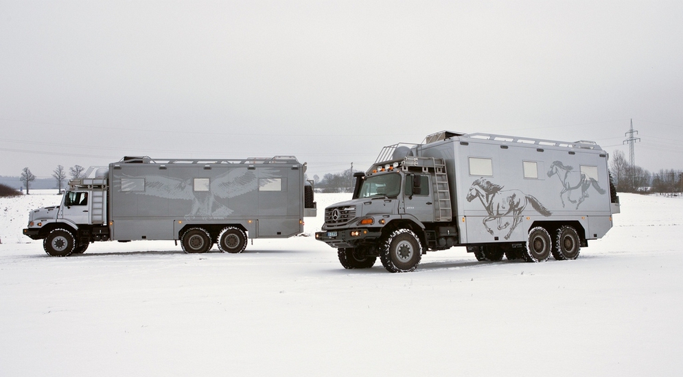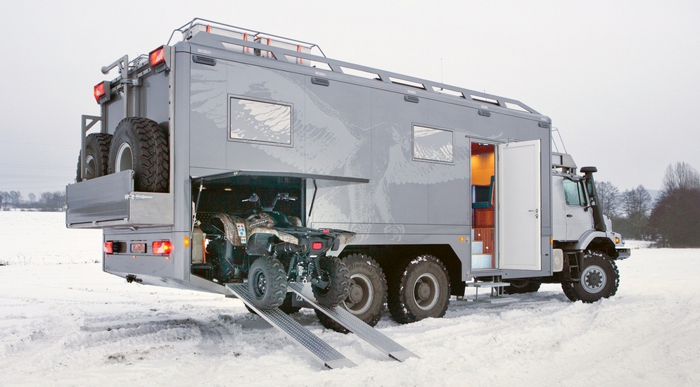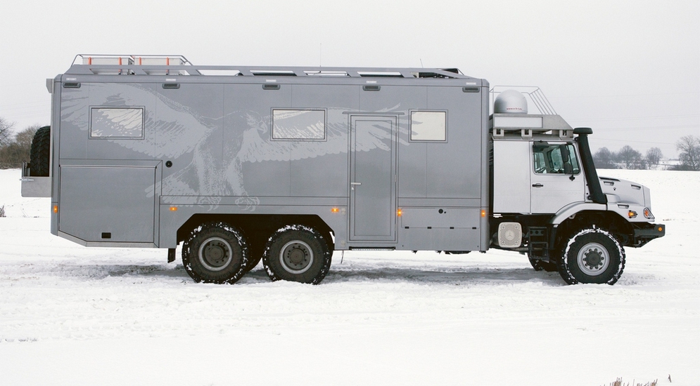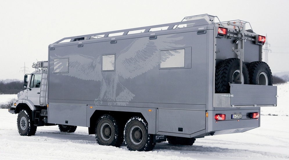 В арсенале штутгартских инженеров есть авто для любых жизненных ситуаций. Кое-что крутое они придумали и на случай зомби-апокалипсиса. А нужно было для этого всего ничего – просто объединить лучший из своих грузовиков-вездеходов с автономным жилым модулем от фирмы Hartmann Spezialkarosserien. Оный представляет собой, по сути, комнату в студенческой общаге, но без клопов, перегоревших лампочек, несвежих простыней и сломанных розеток. Вместо подобных «радостей» помещение длиной 5,6 метра и шириной 2,4 метра выполнено из пластиковых оцинкованных панелей, полностью автоматизировано, а в его крышу из углеродного волокна встроены нагревательные элементы (чтобы растапливать снег и ледяные наросты в зимний период).