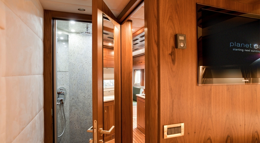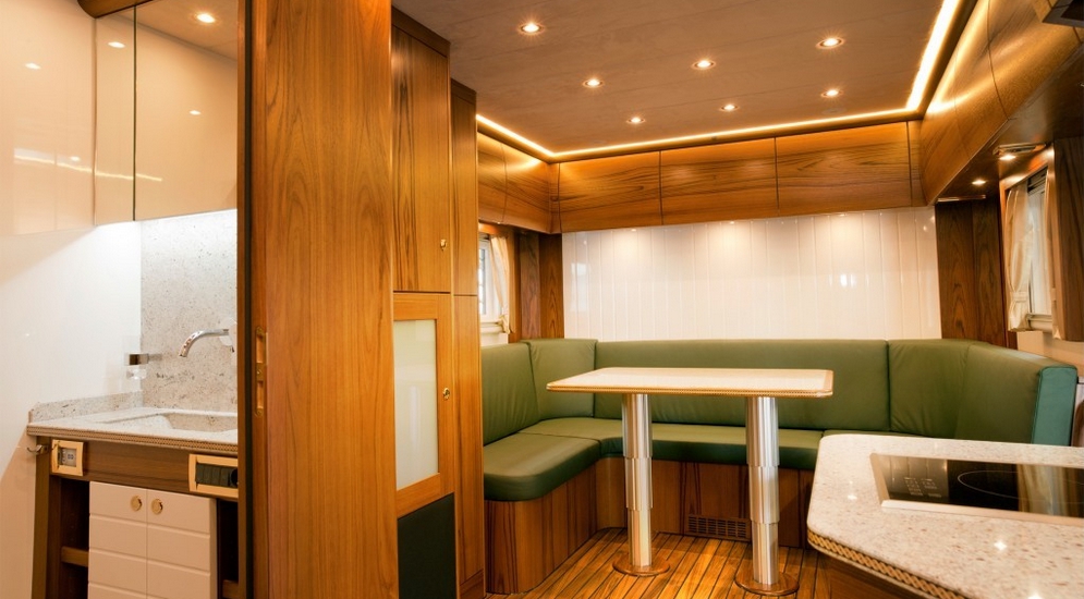 Удобств в этом суперкемпере столько, что все и не перечислить. Из самых очевидных можно отметить укомплектованную кухню, двуспальную кровать, угловой диван, ванную комнату с душевой кабиной, две встроенные LED-панели с подключенной спутниковой тарелкой и аудиосистемой Bose и круглосуточным доступом в интернет